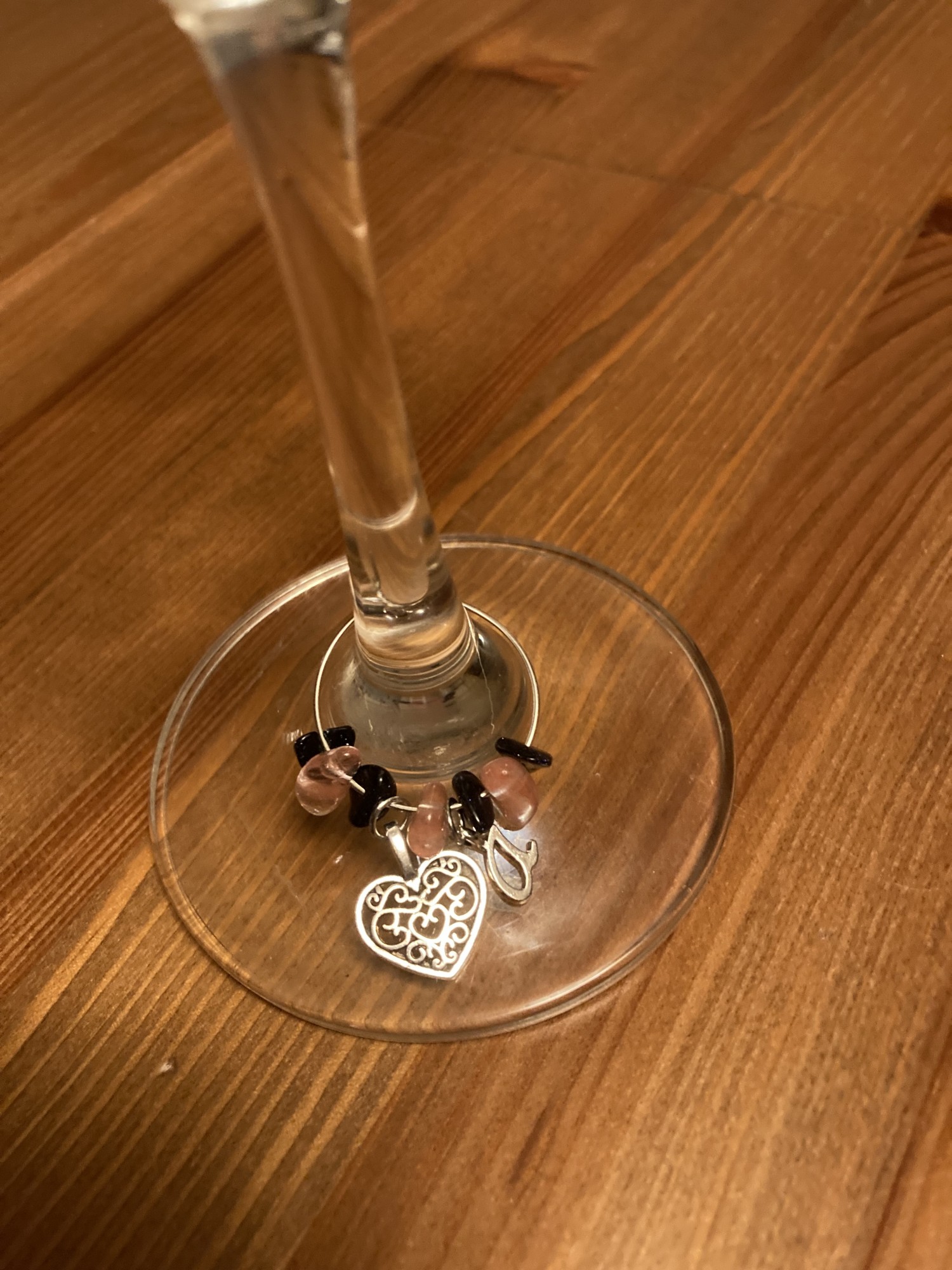 Handmade wine glass charms. Each charm has a heart, 7 gemstone chips in a variety of colours and an initial letter.