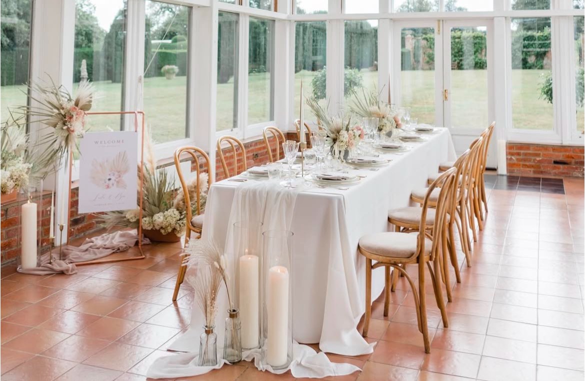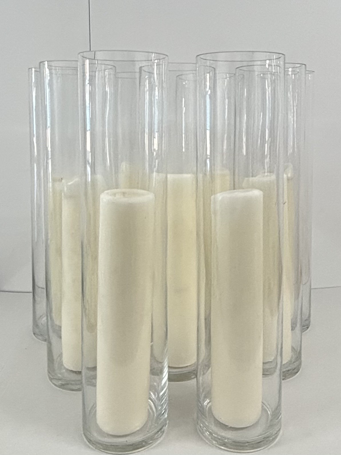 Extra large clear glass floor standing candle vases and candles for ceremony aisle decor or end of table styling.