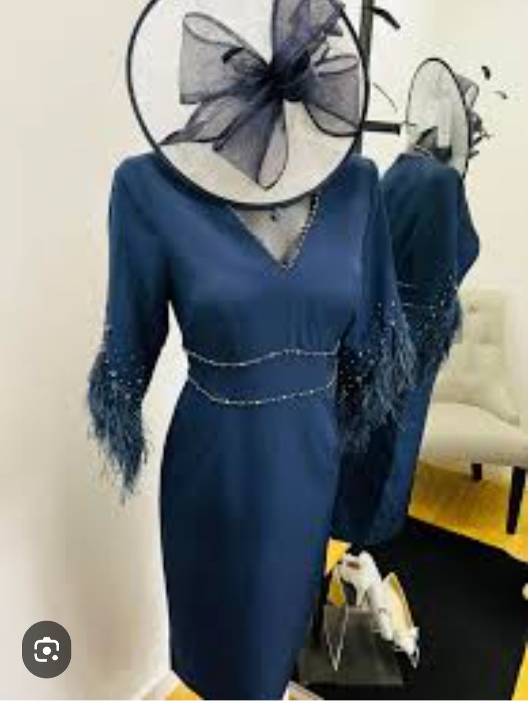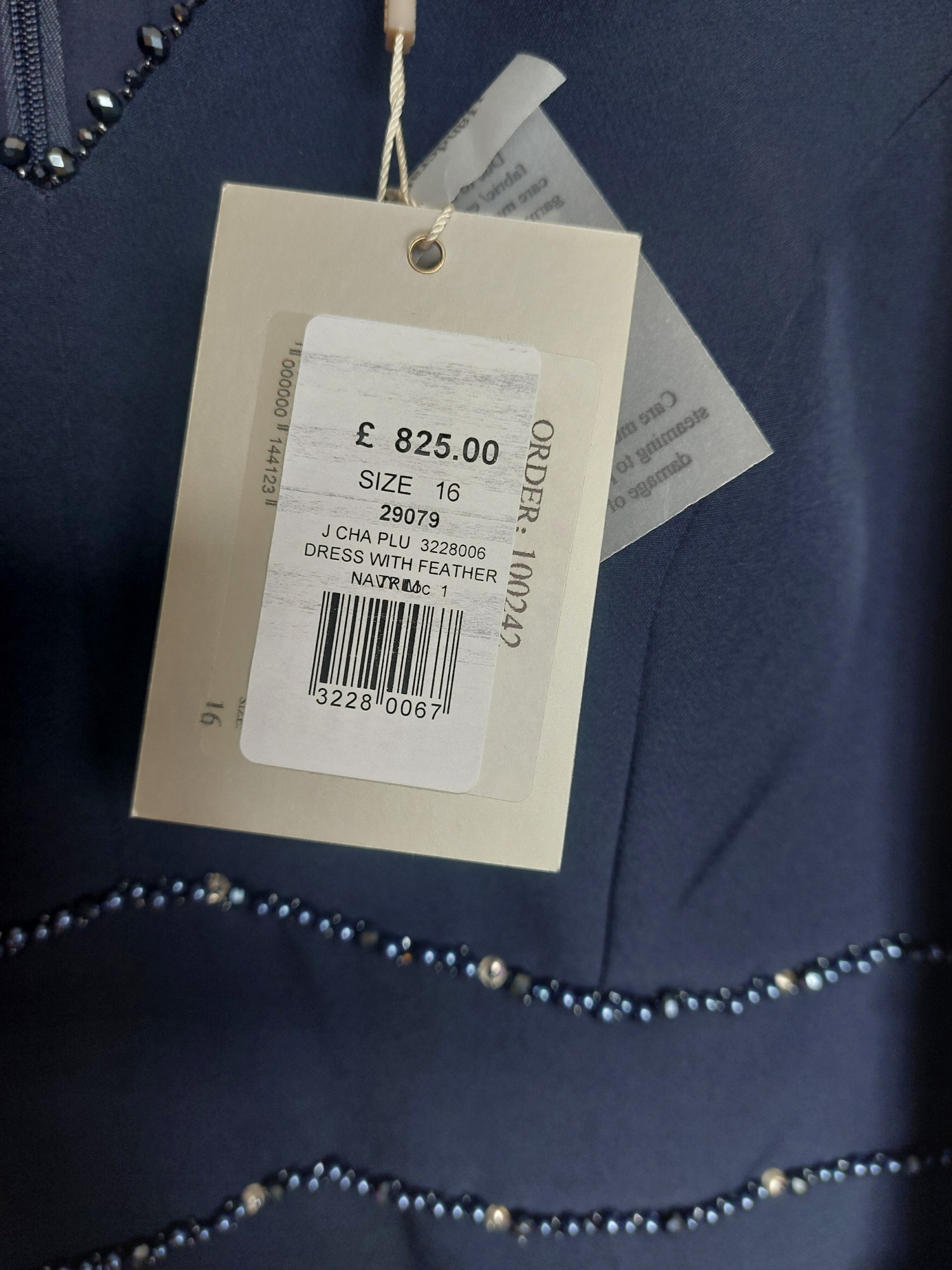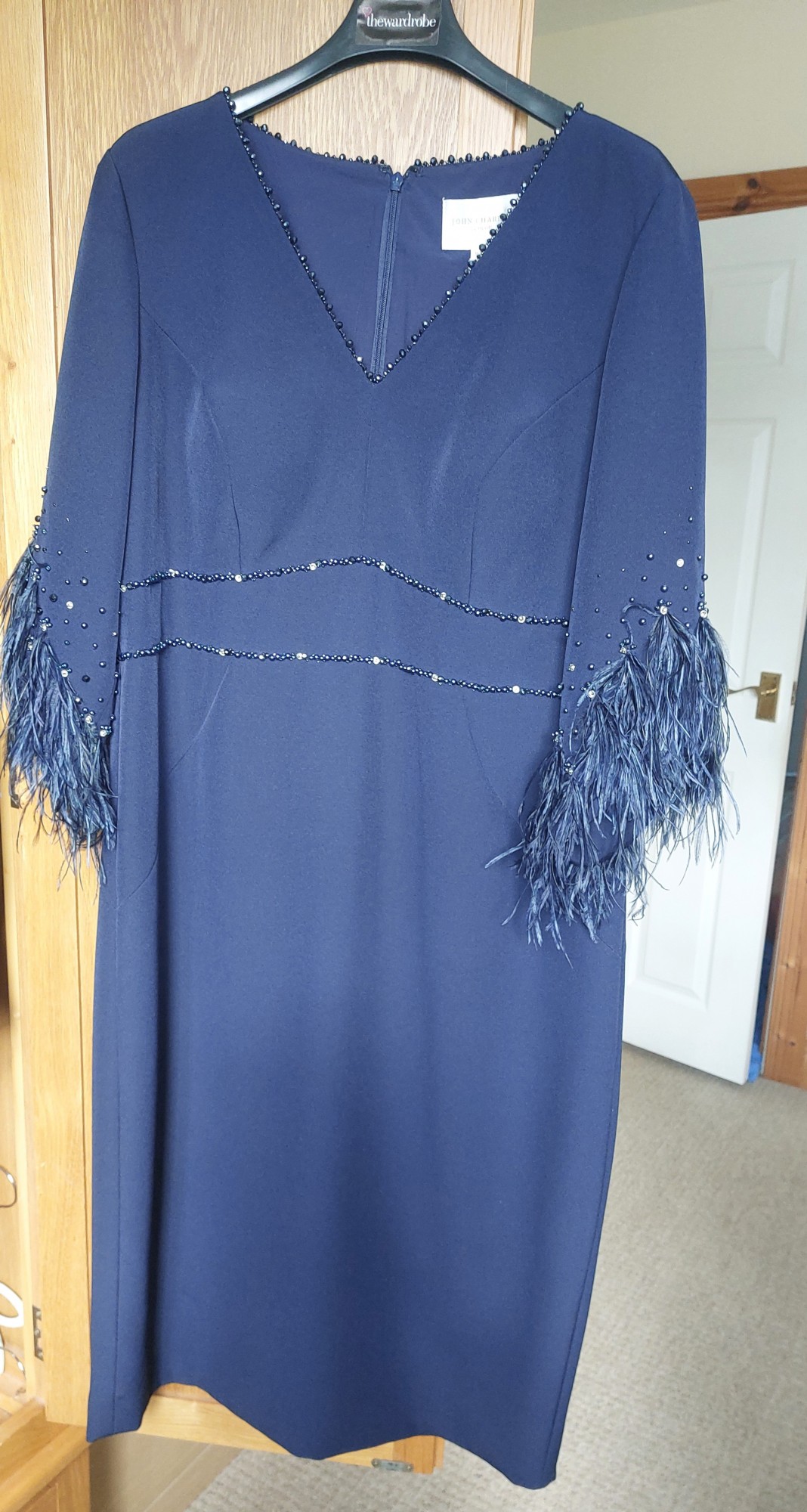 John charles Navy beaded dress. Cost £825 new - never worn. Size 16. Three quarter sleeves with feather trim,fitted waistband, pearl detail