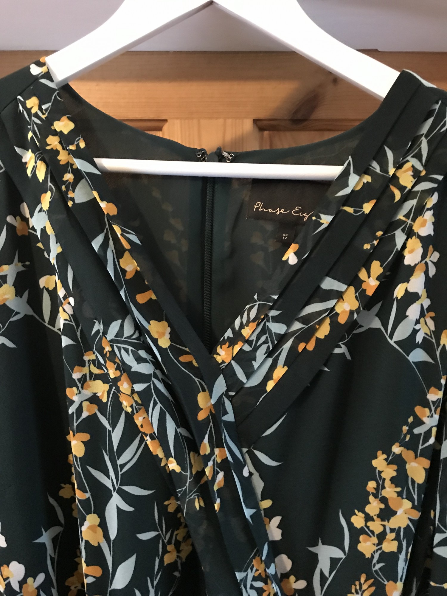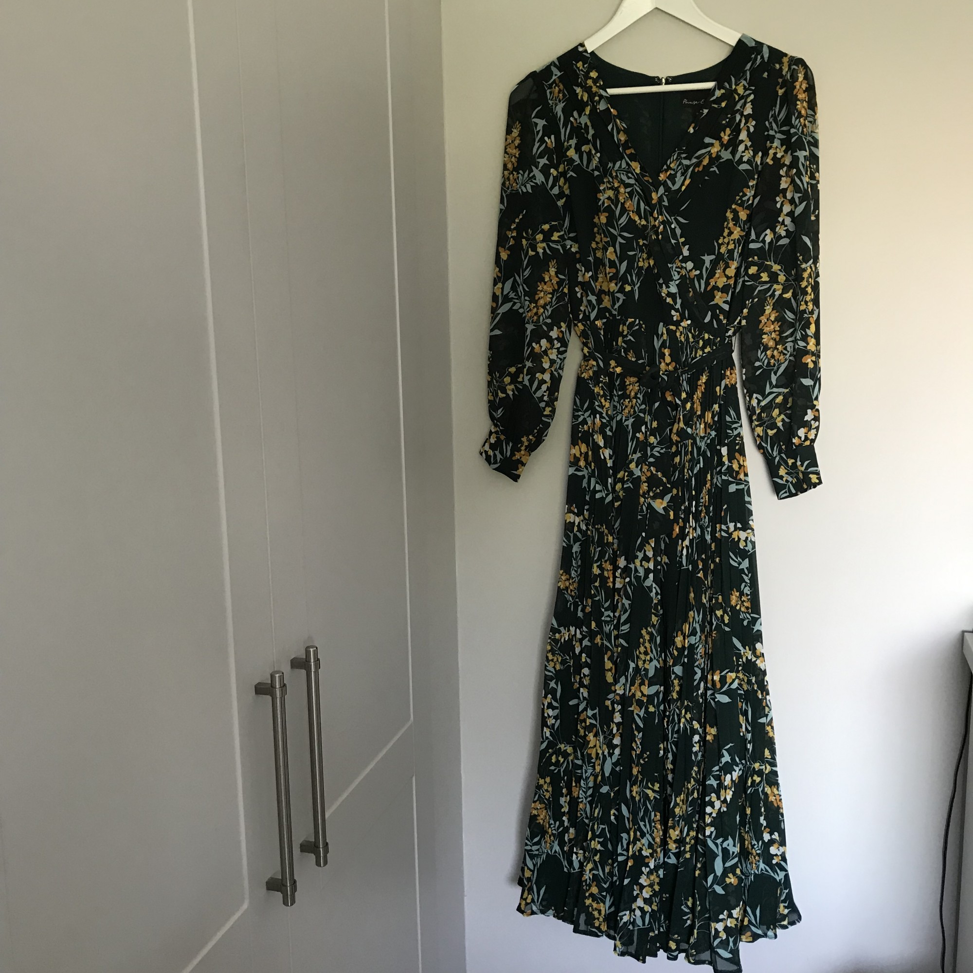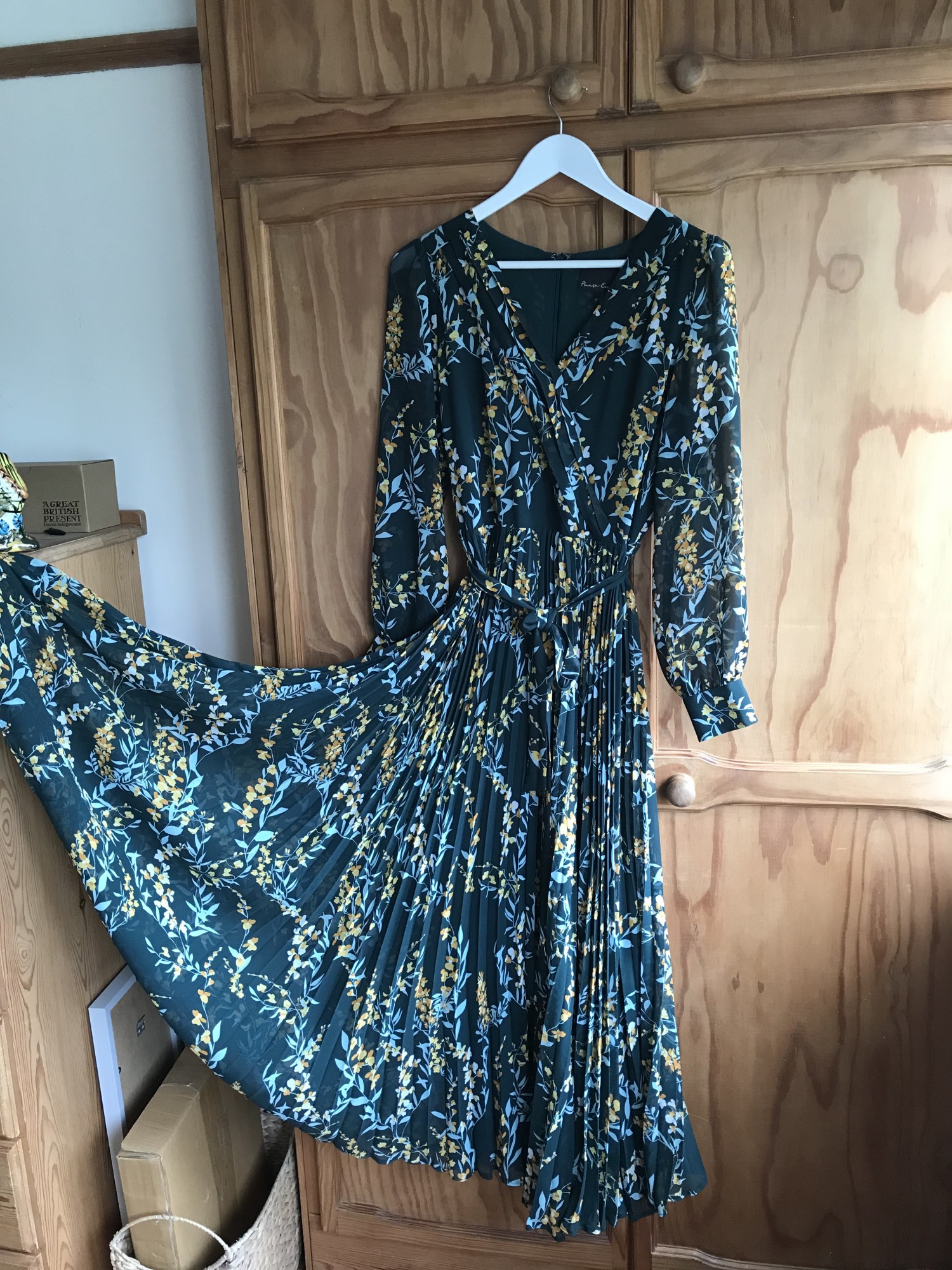 Beautiful green midi length bottle green patterned dress. Perfect for a wedding guest. It has a 'v' neckline and long sleeves. The dress is lined but the sleeves are not. The background is dark green with delicate duck egg blue petals and small mustard flowers. The dress has a lovely swing to it when you walk.
