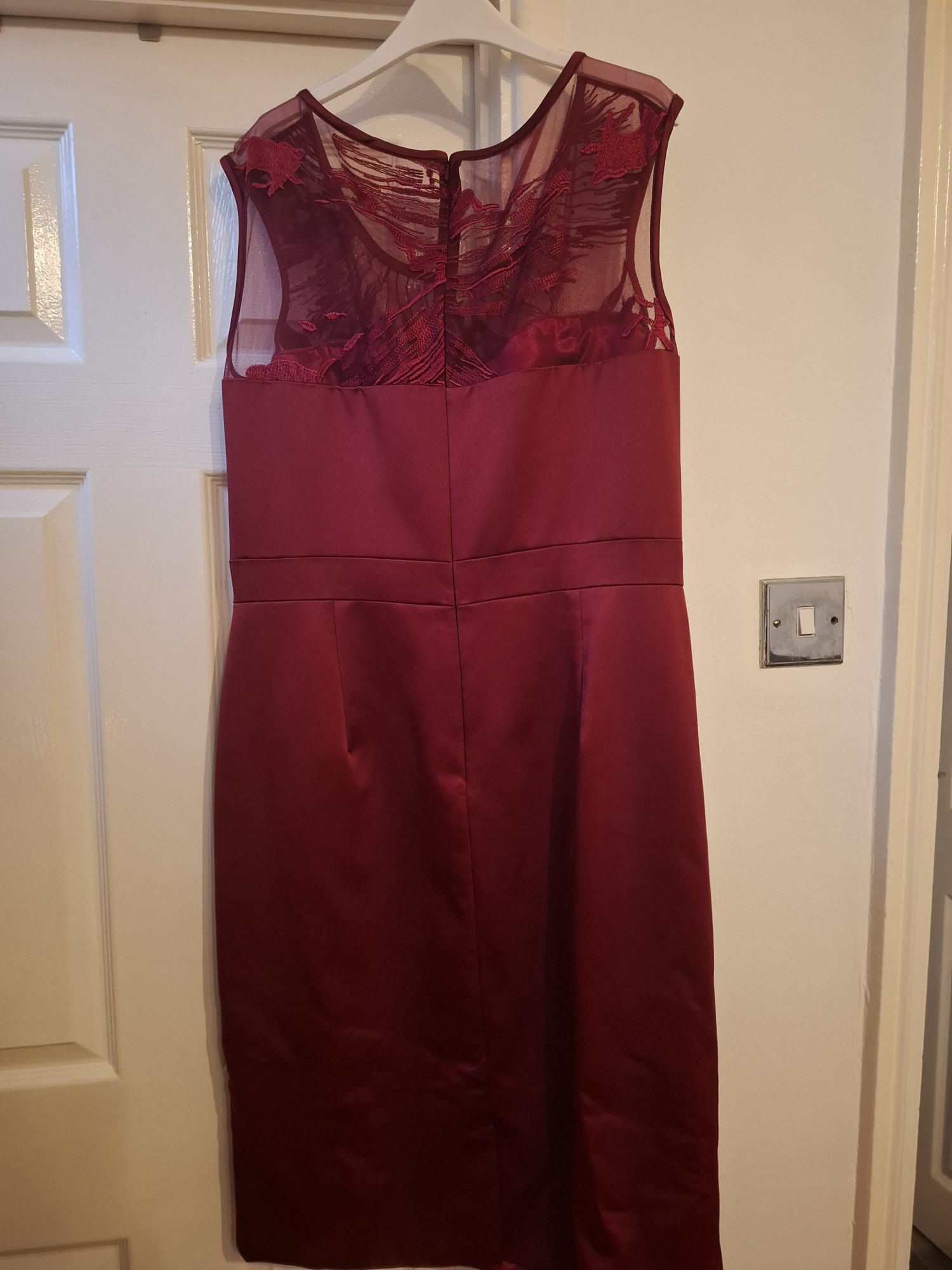 Burgundy dress with detail and a long over jacket, also hatinator, shoes, bag to match