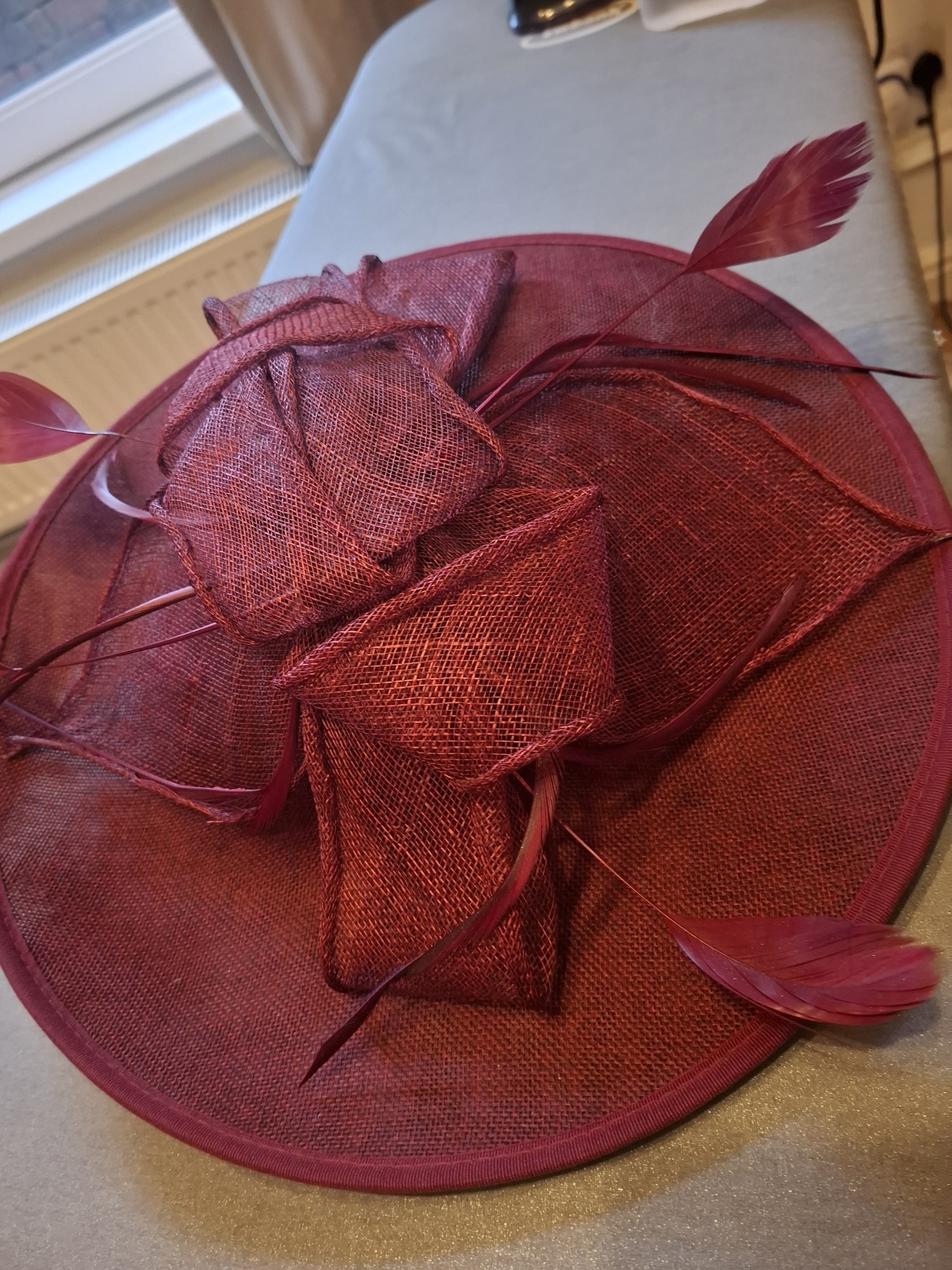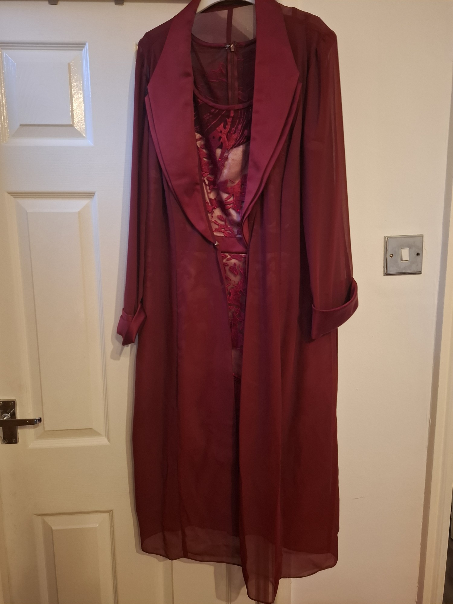 Burgundy fitted dress with overcoat, also shoes, hatinator and  bag
