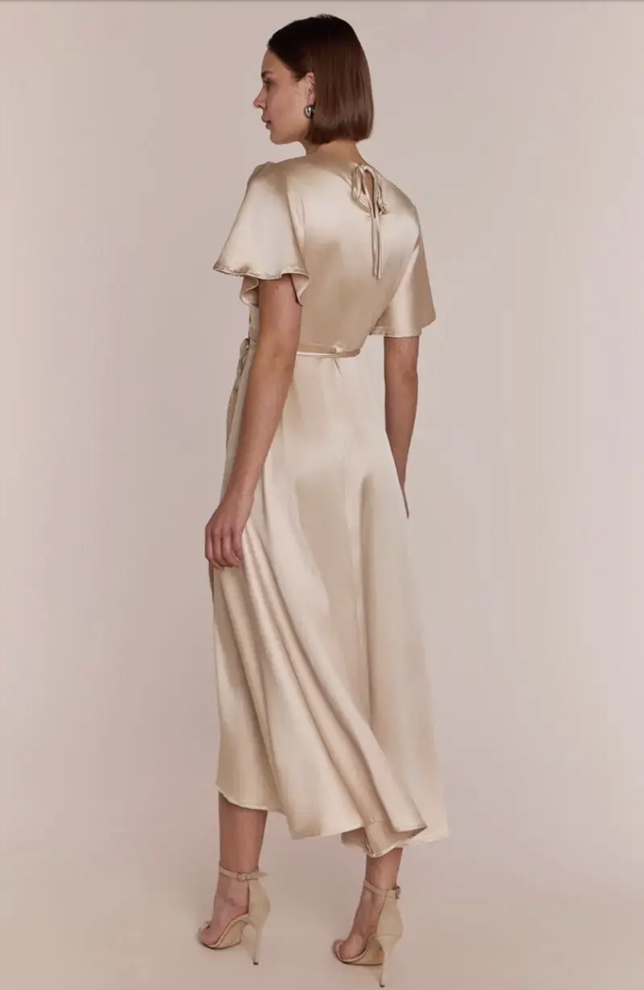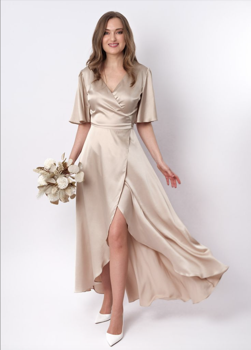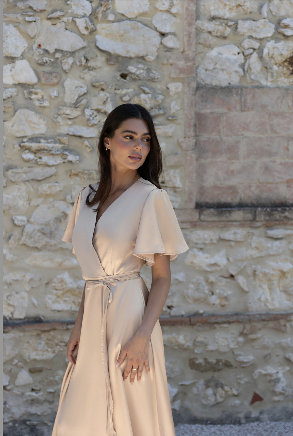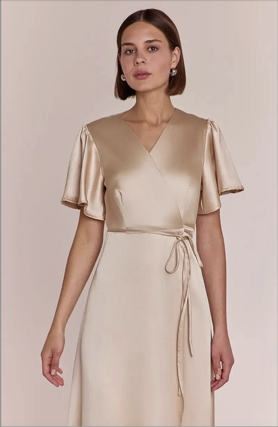 The Florence Waterfall Dress in Champagne is an ankle-length satin wrap dress with a waist tie and keyhole back, perfect for walking down the aisle or worn as a wedding guest gown or cocktail dress. A-line for a flattering fit and perfect for any wedding - from black tie to summer garden party.