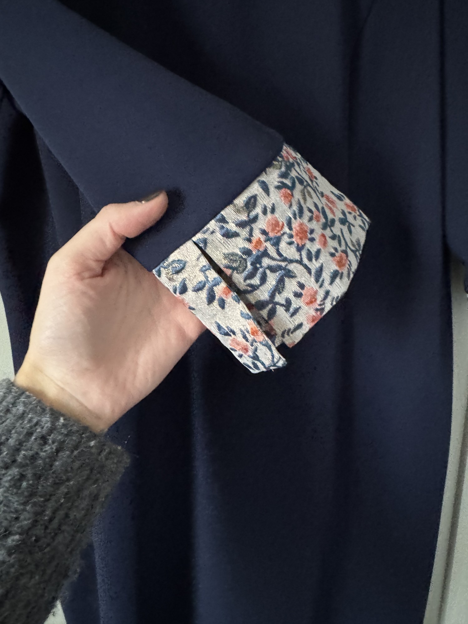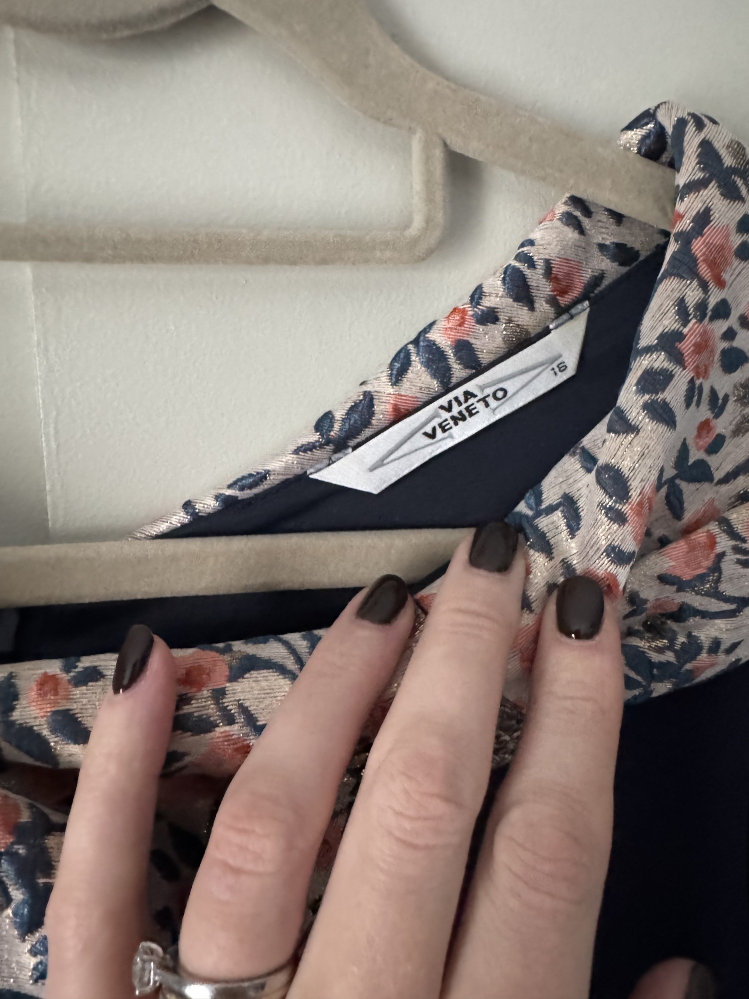 Beautiful navy and embroidered Via Veneto dress with boat neckline and collar detail.