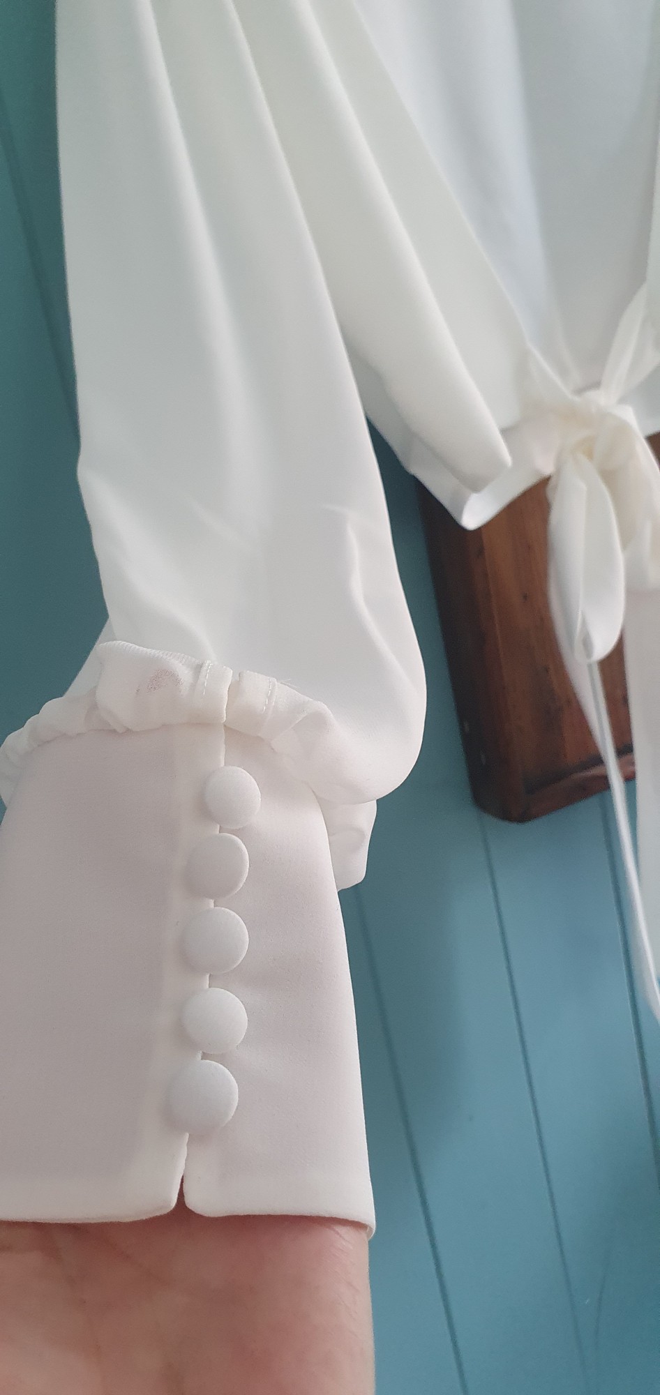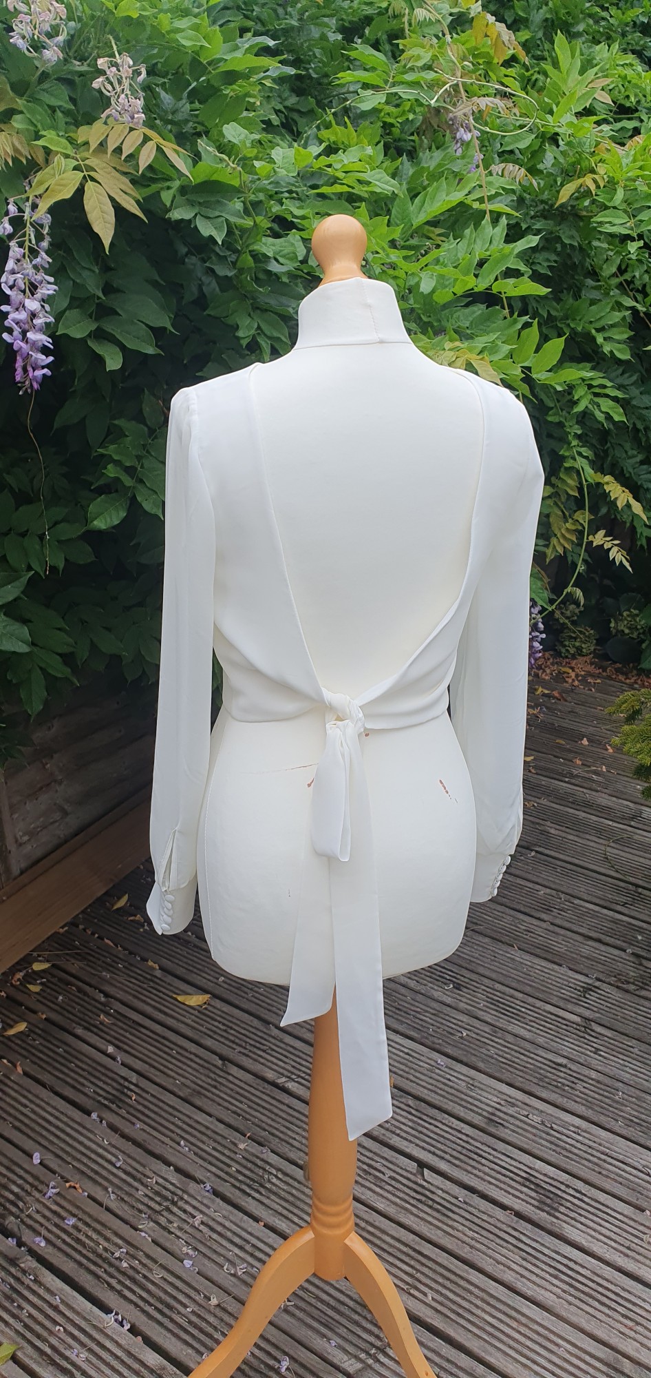 Beautiful long sleeved chiffon top with buttoned cuffs. V back to the waist with tie back