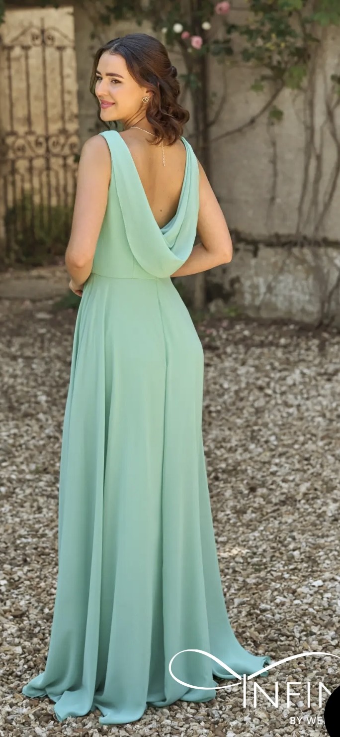 Mint Green Chiffon Bridesmaid Dress. Fitted bust, cinched waist then flows to floor. Beautiful Cowl back to the dress which is a real statement.