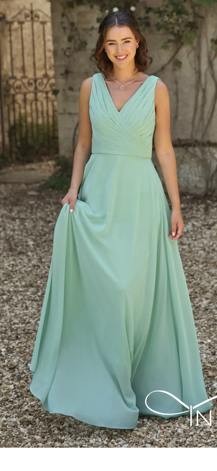 Mint Green Chiffon Bridesmaid Dress. Fitted bust, cinched waist then flows to floor. Beautiful Cowl back to the dress which is a real statement.