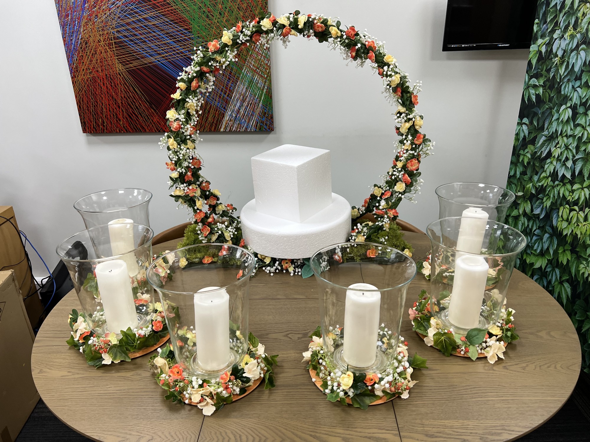A generous collection of coordinated venue décor pieces designed to add warmth, height and romantic detail throughout your wedding space. Used once at our wedding and carefully stored, this bundle is ideal for dressing aisles, entrances, walls, tables and evening areas with a cohesive, polished look.