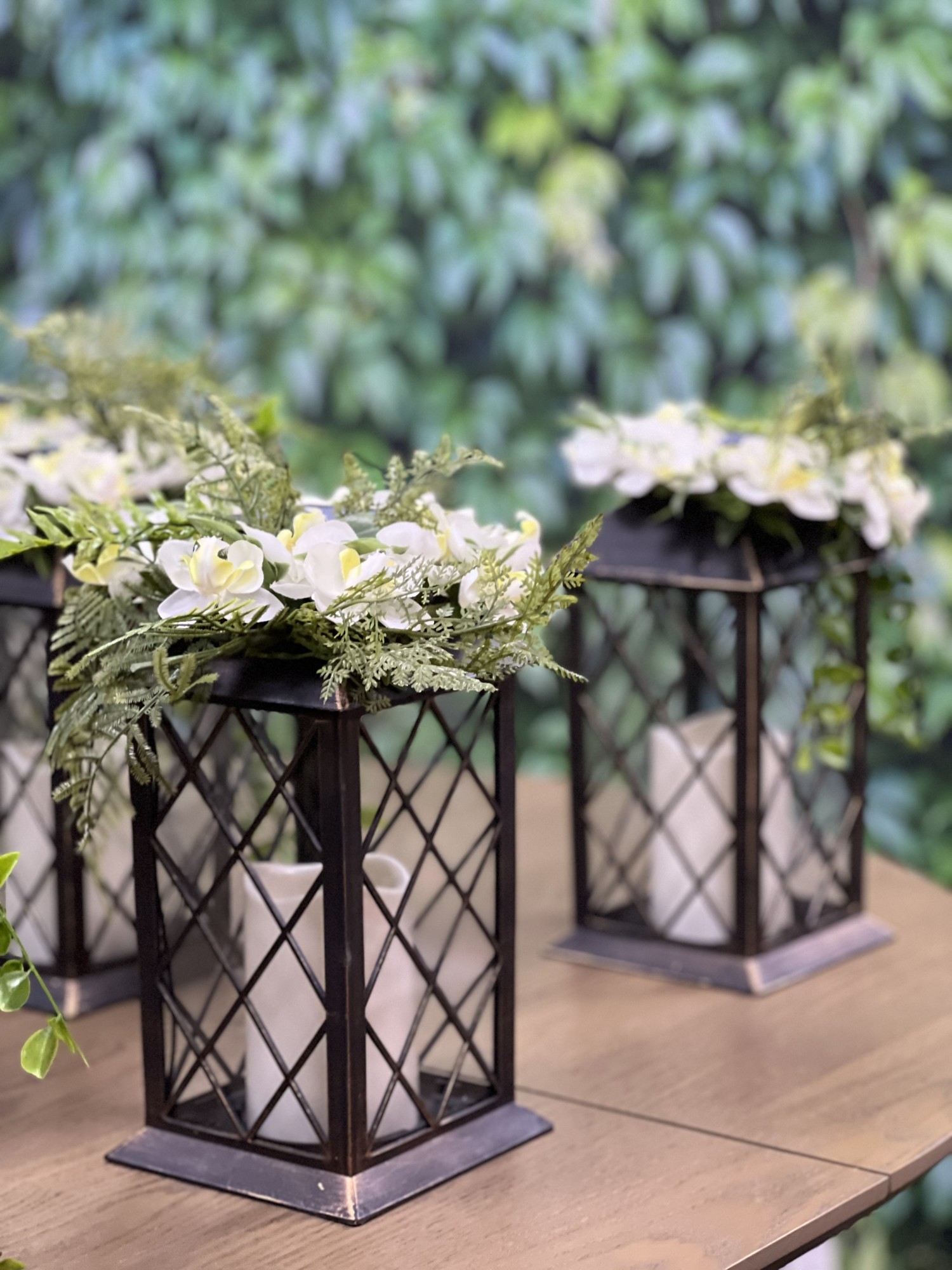 10 × white lanterns decorated with white orchids (suitable for candles or fairy lights)
