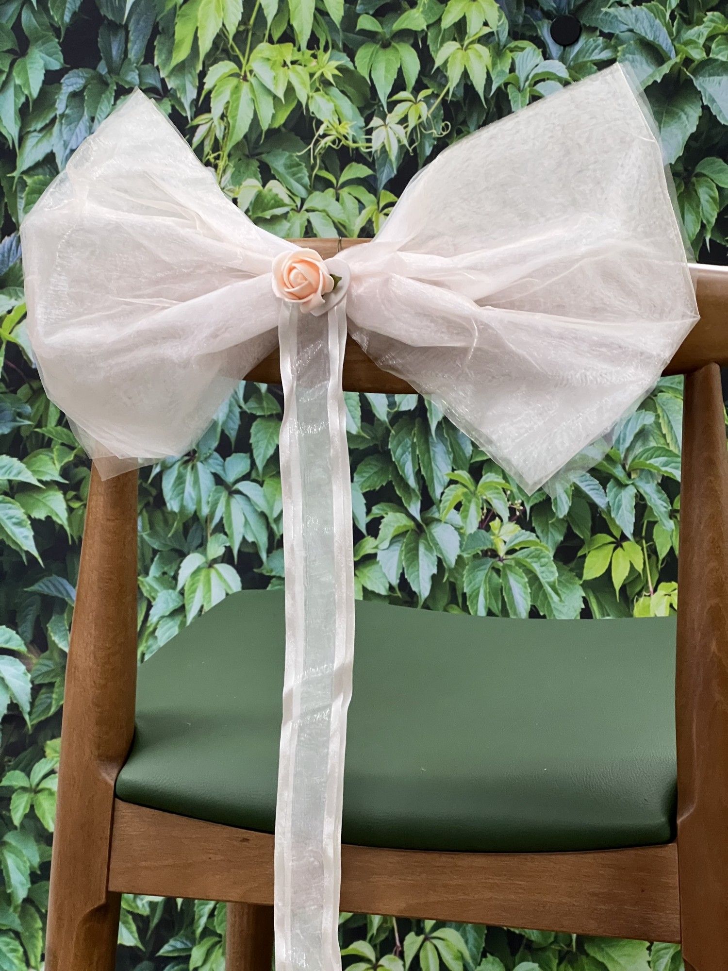 39 × white organza bows with ribbon and floral details (perfect for chairs or wall lights)
