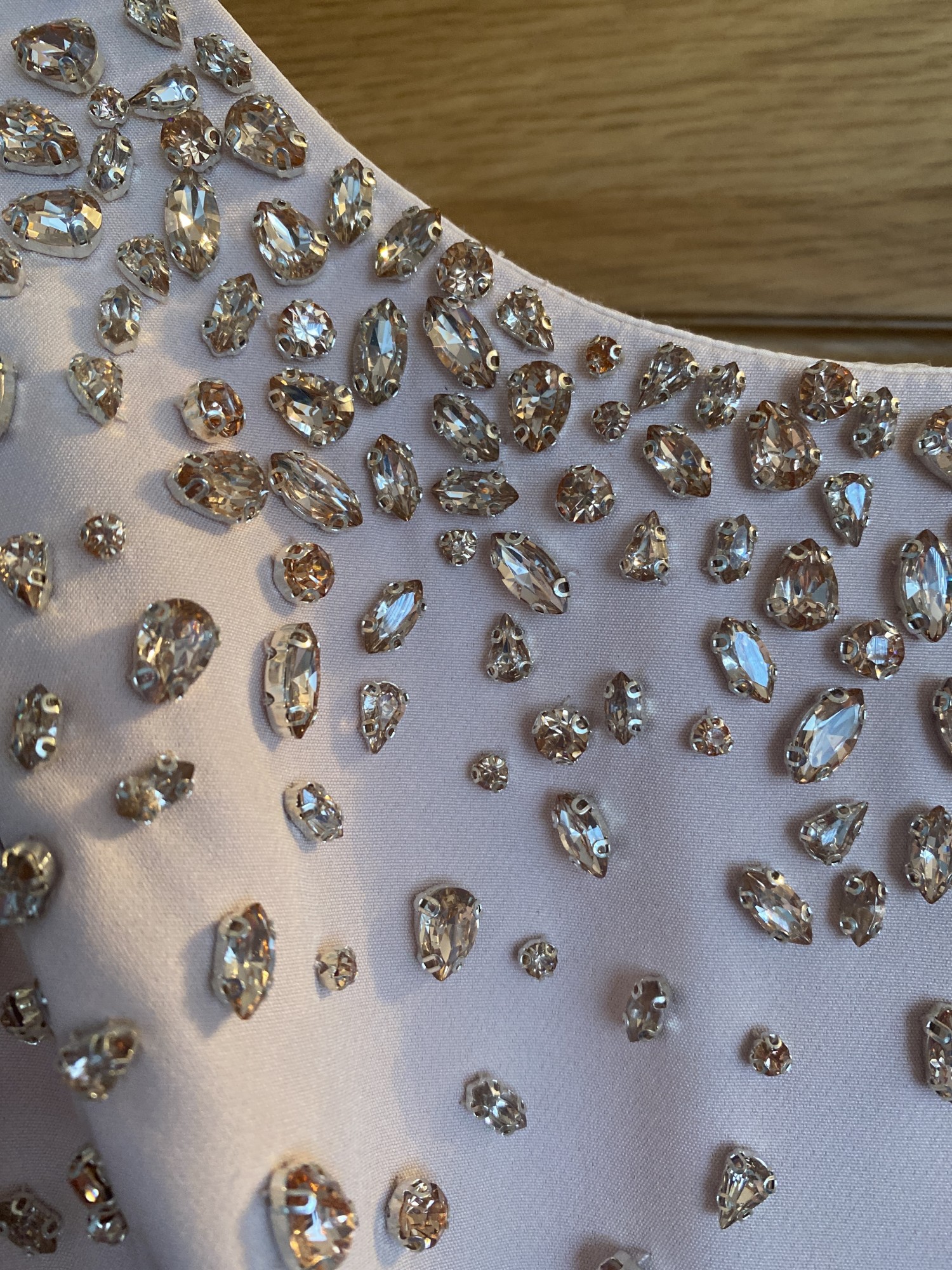 A classic fit and flare crepe dress, featuring a beaded bodice and 3/4 sleeves.  Complete with contrasting plain skirt.  Comfortable dress to wear.