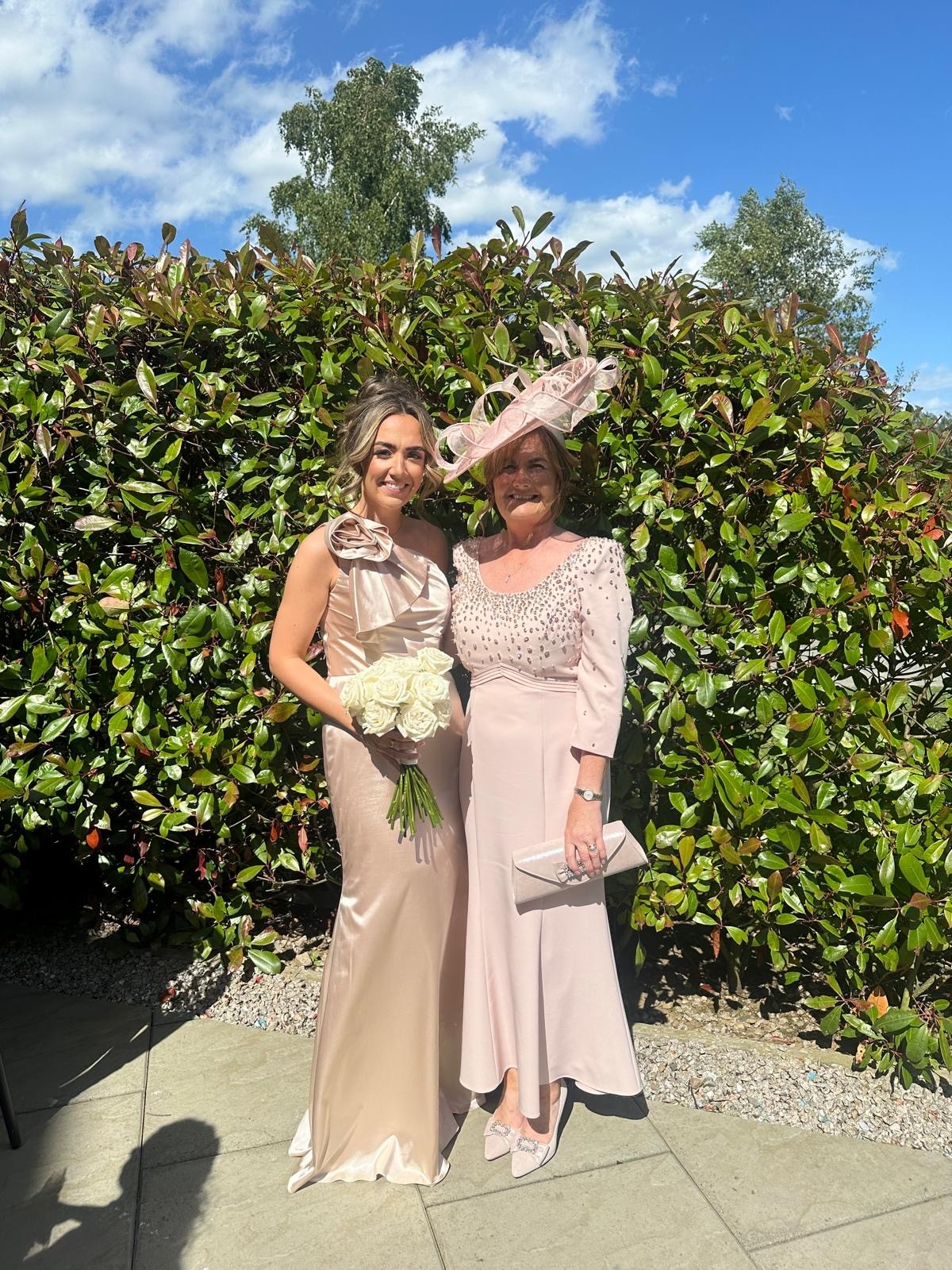 A classic fit and flare crepe dress, featuring a beaded bodice and 3/4 sleeves.  Complete with contrasting plain skirt.  Comfortable dress to wear.