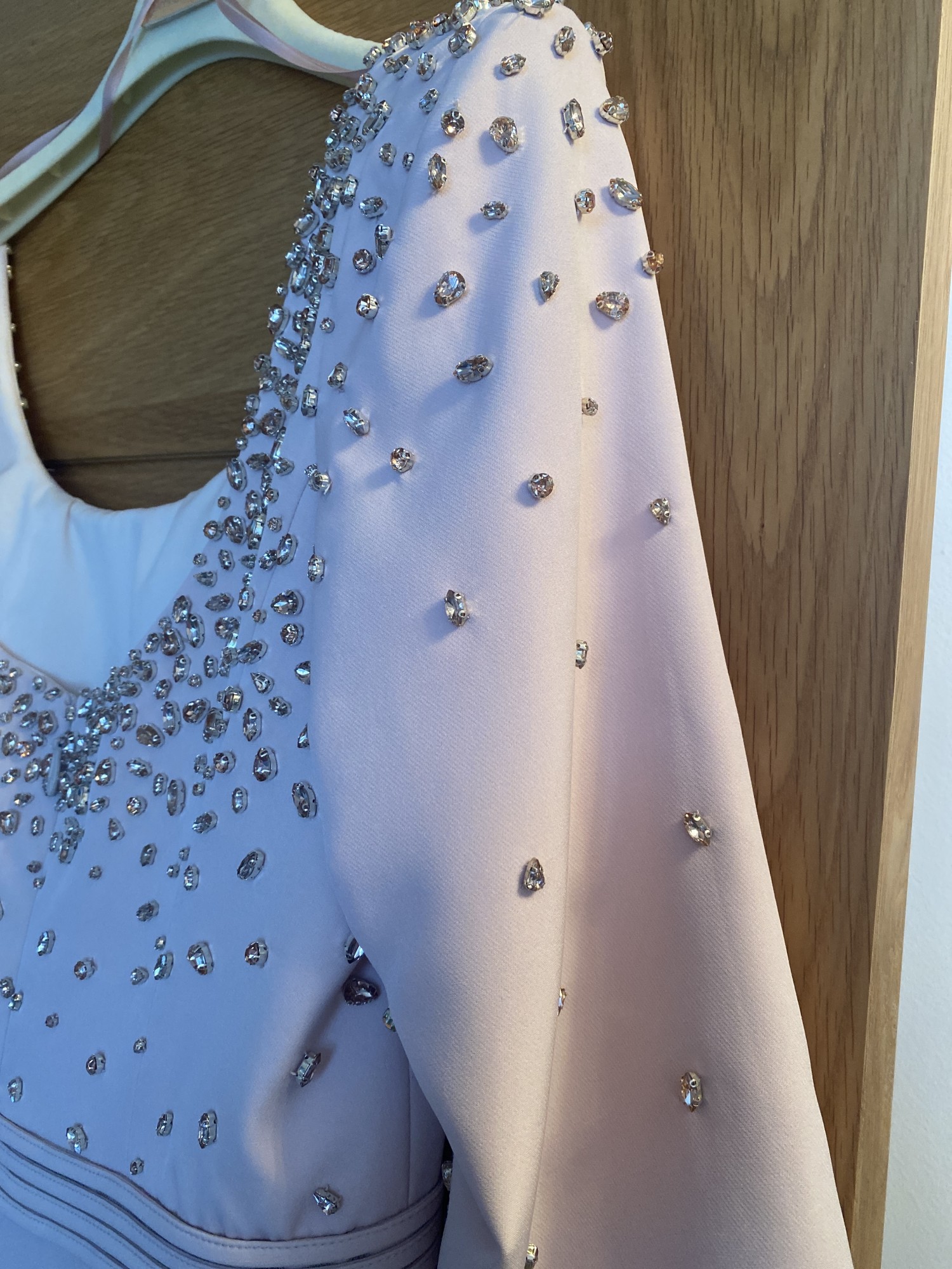 A classic fit and flare crepe dress, featuring a beaded bodice and 3/4 sleeves. Complete with contrasting plain skirt. Comfortable dress to wear.