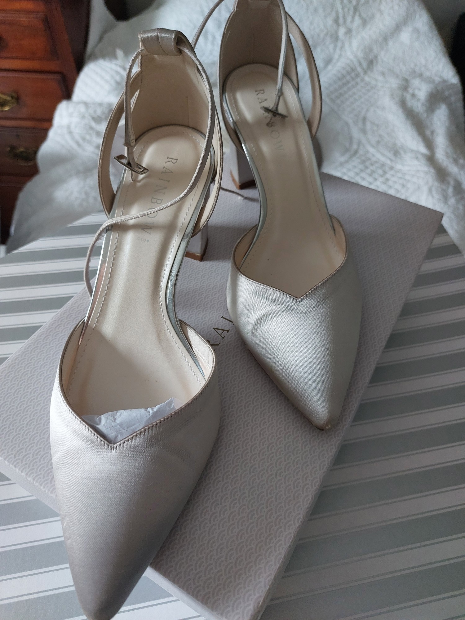 Satin look taupe 3" block heel with ankle strap and cut away sides. Mid-wide fit and very comfortable. Had specially dyed to match the ivory/taupe dress.