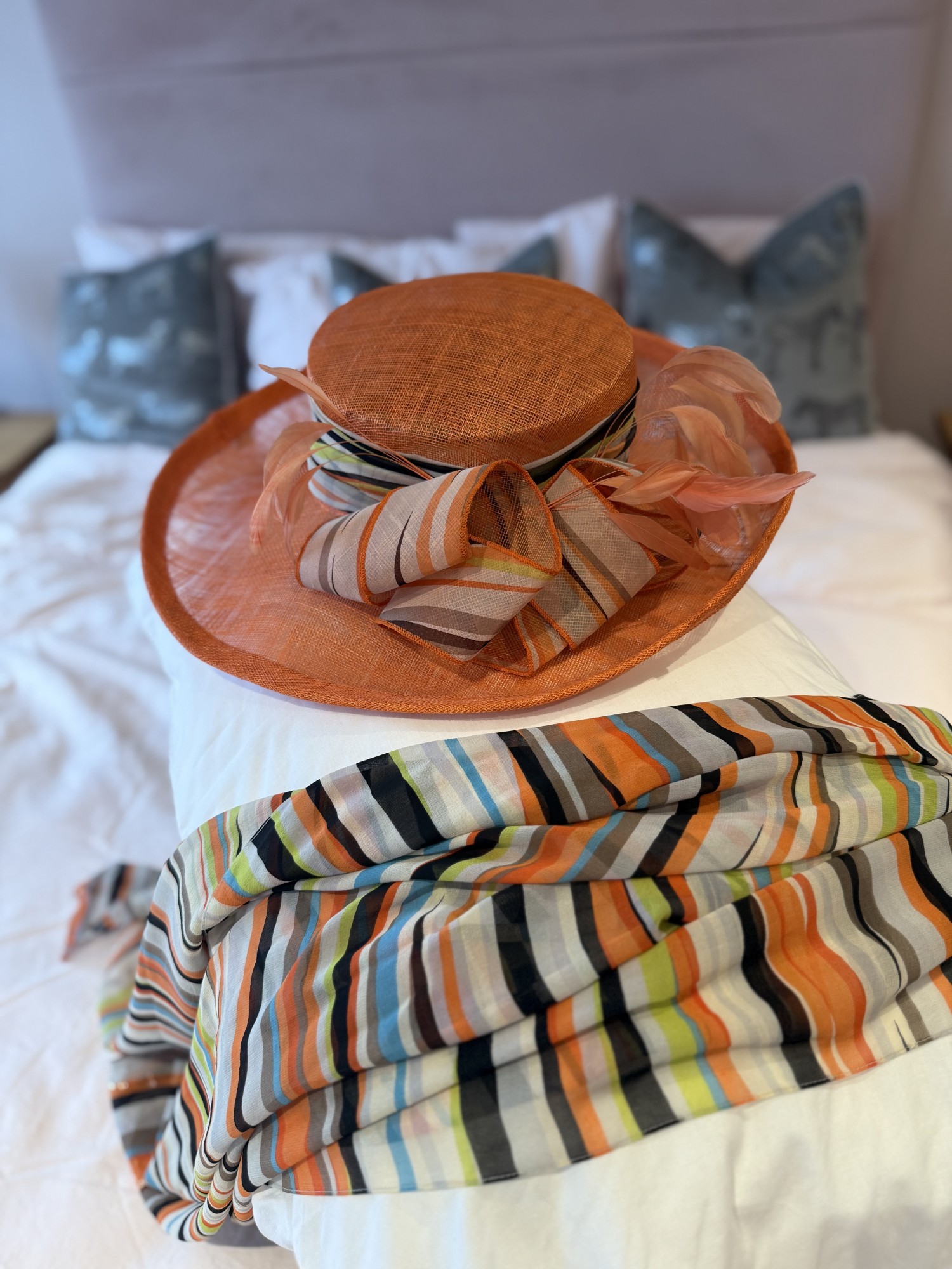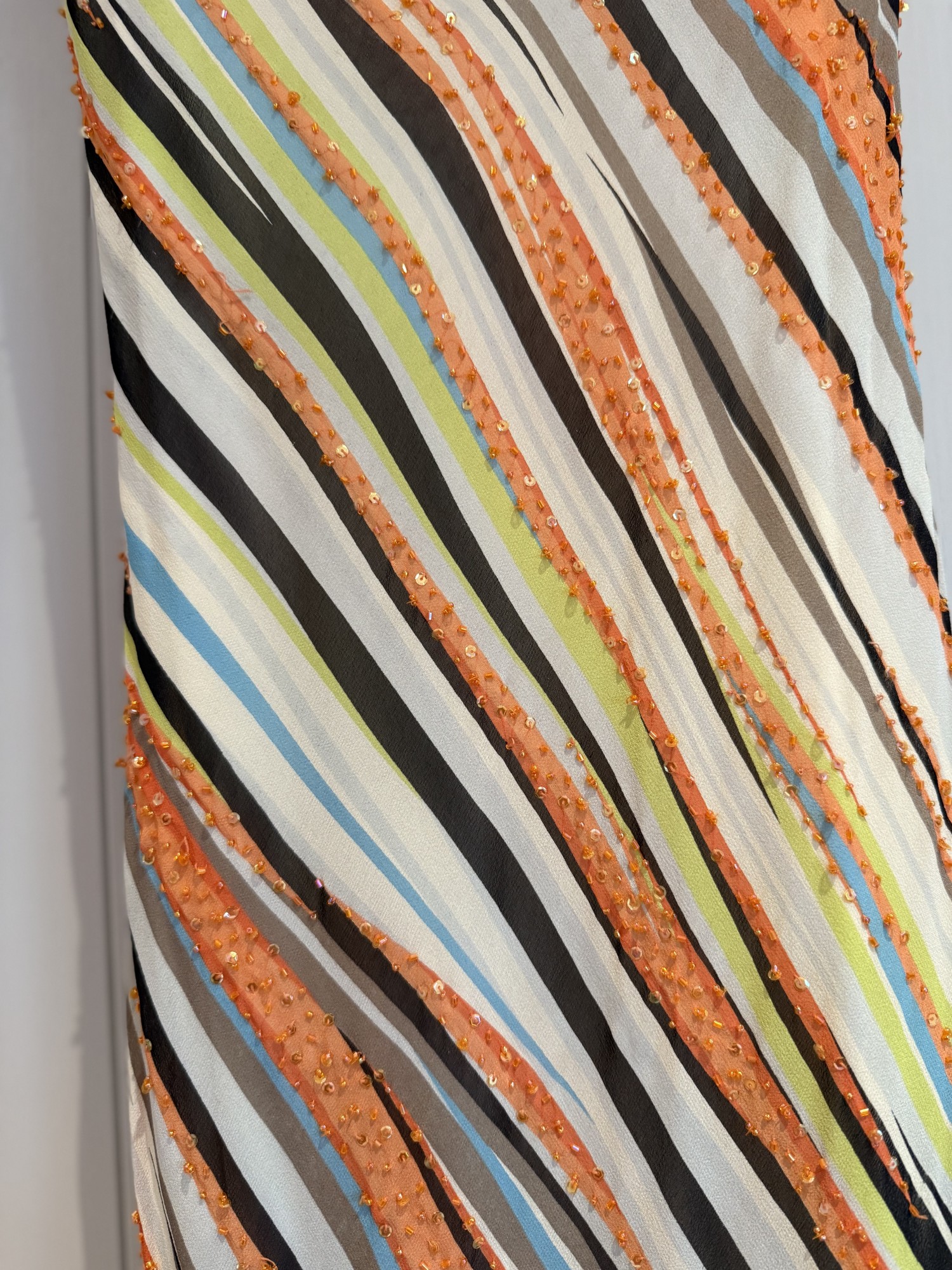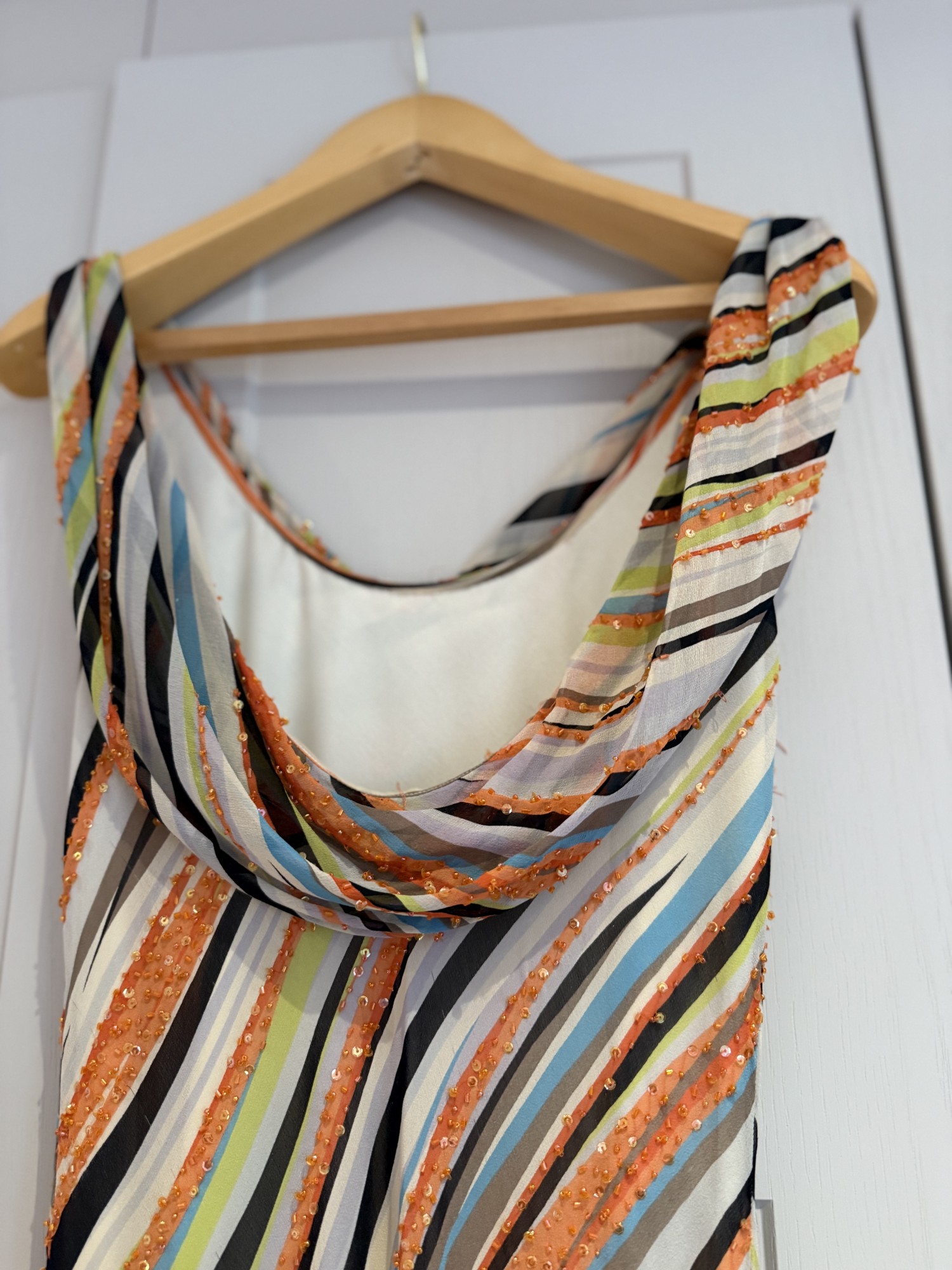 After Six dress & Hat is a Orange multi-coloured striped beaded maxi dress with an asymmetrical, cowl neckline and a bias cut silhouette with beautiful beading throughout.