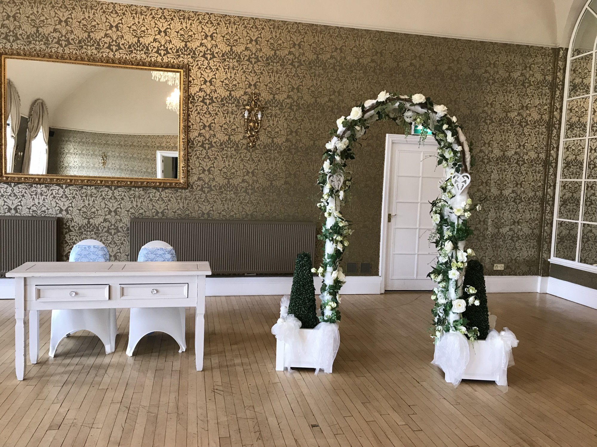 A white plastic arch, covered with white faux flowers and 2 plastic boxes either side with faux box trees.