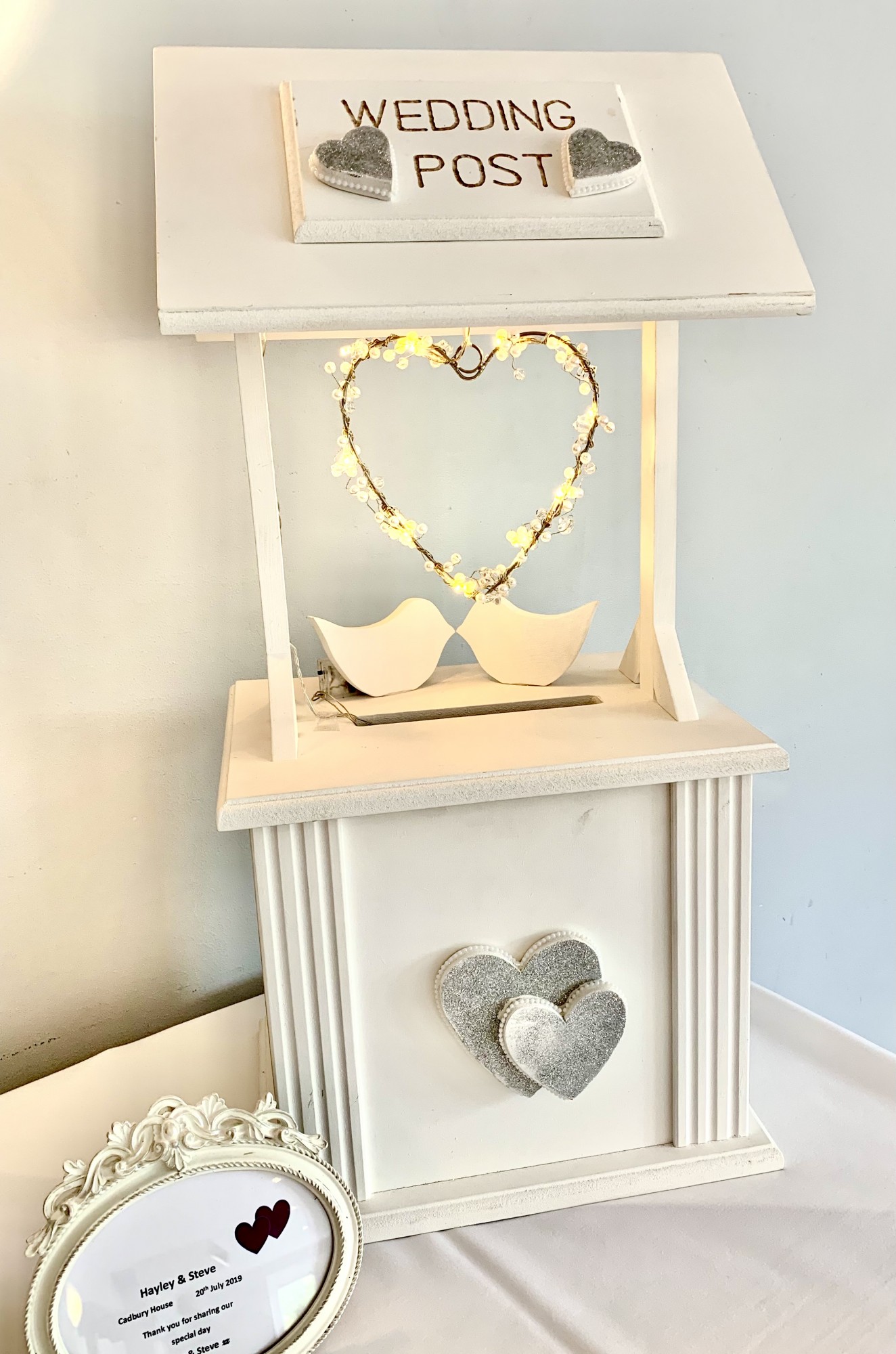 Beautiful wishing well post box. I am selling my wedding decor business stock as I have retired. The wishing well has been used for previous weddings but is still lovely. The base and the top come apart for transportation and to retrieve the wedding cards. The aluminated heart can be removed. Pick up only.