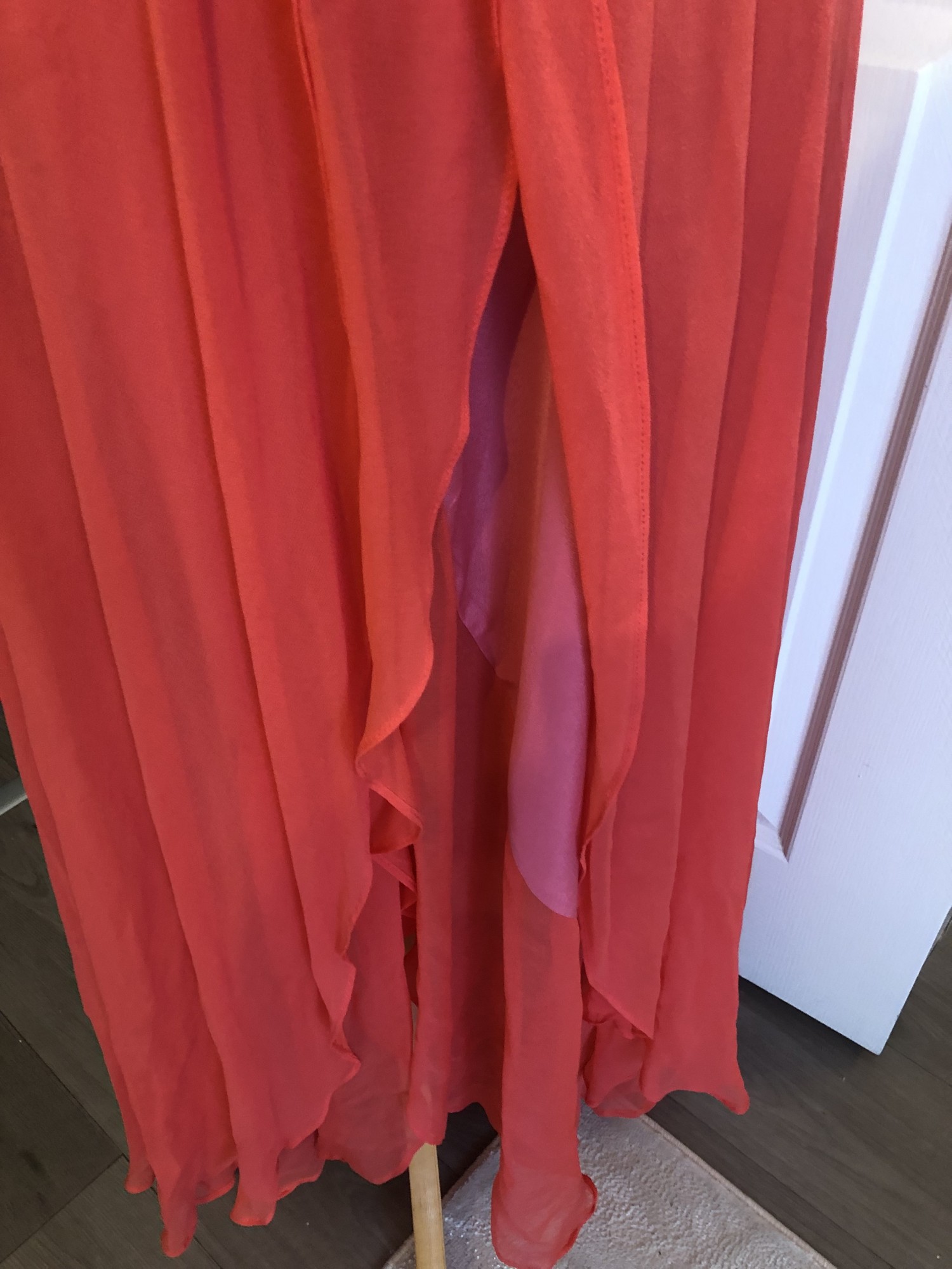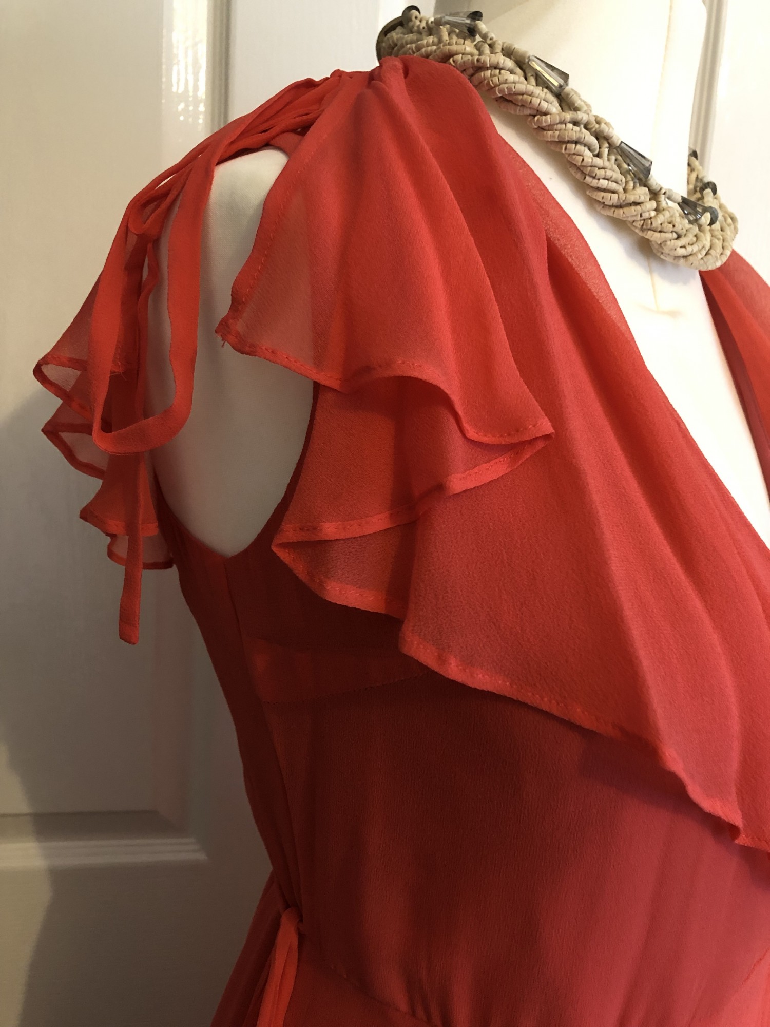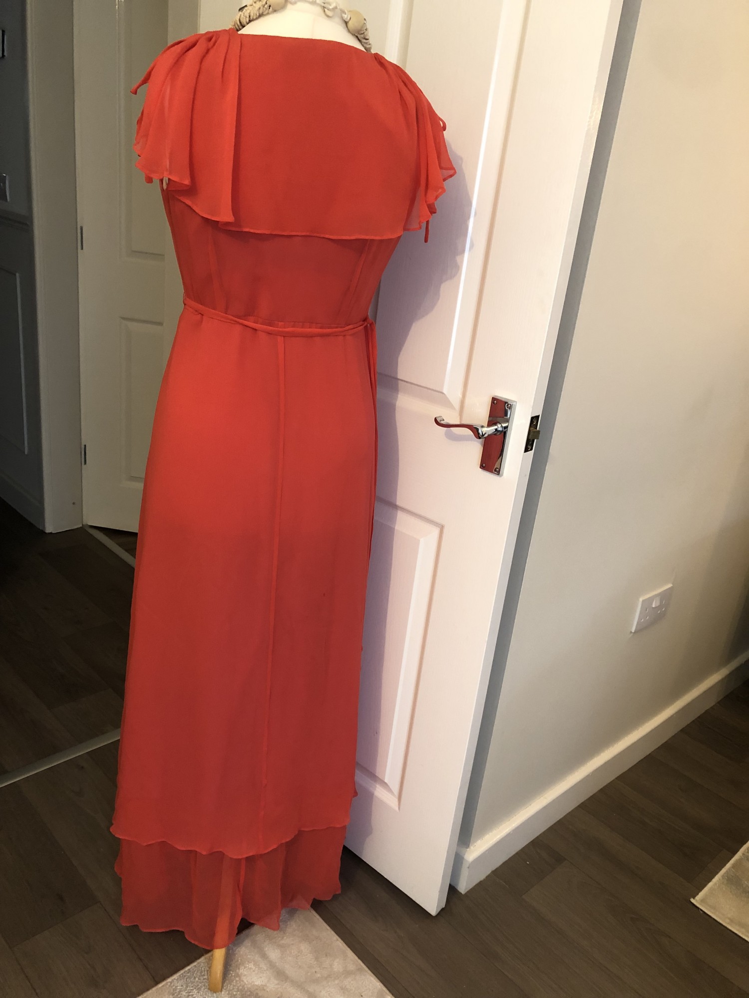 An elegant silk dress is vibrant coral colour, Fully lined with frill details in the front, featuring an attached cape on the back, short sleeves with ties, perfect for any special occasion, As new worn once for a wedding last year. Design by Amost Famous