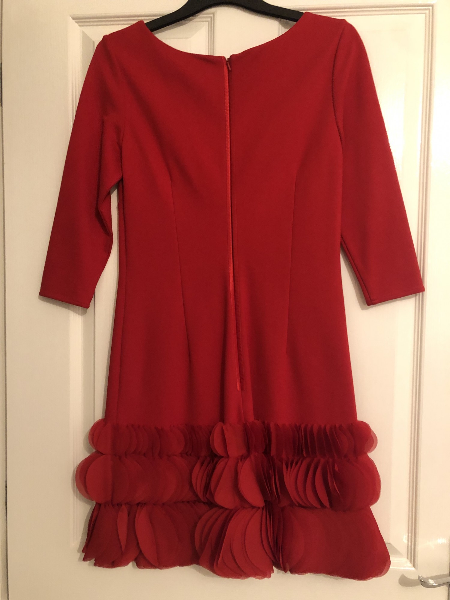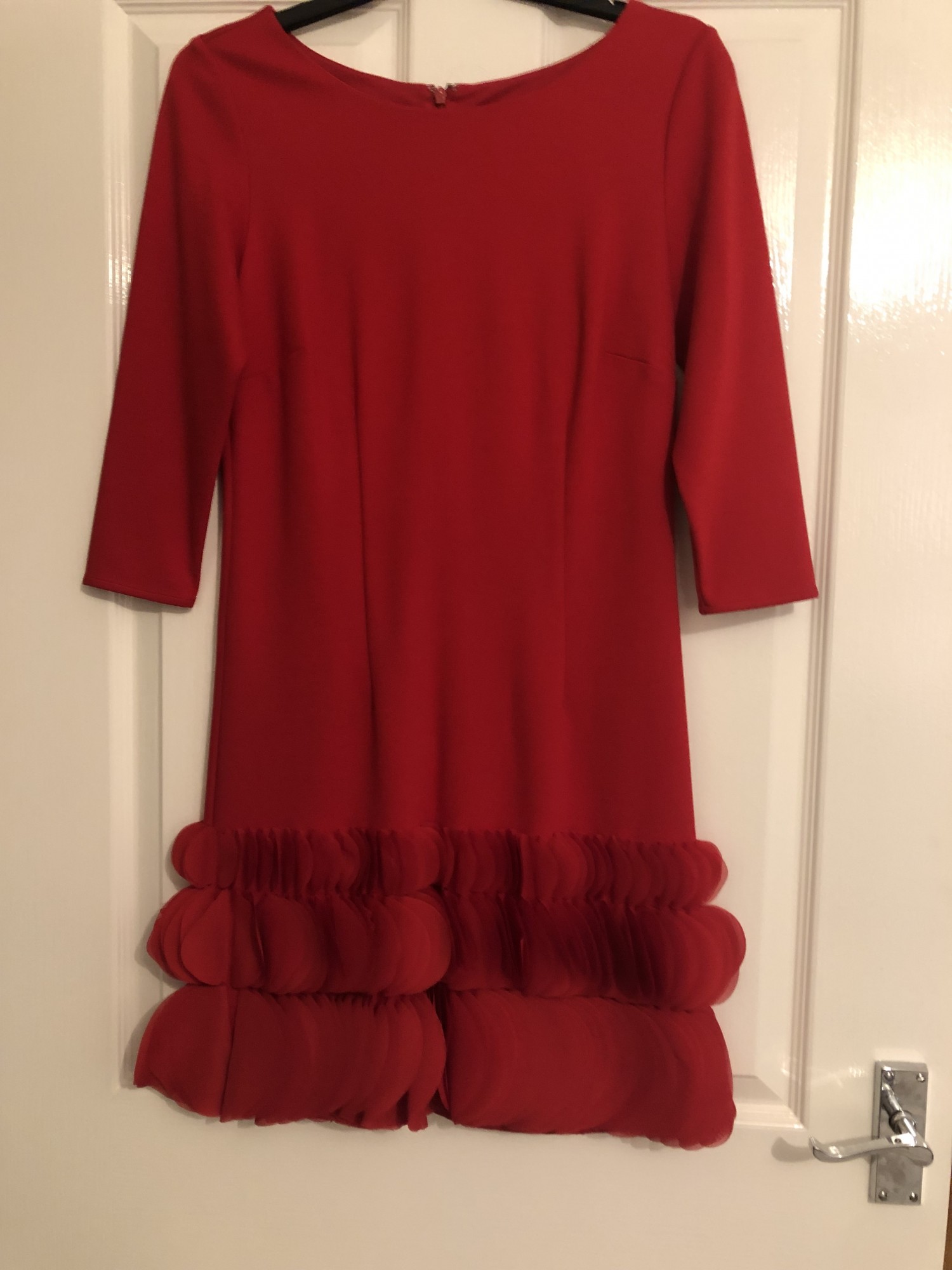 A statement Vibrant red dress for that special occassion, featuring a round neckline, 3/4 sleeves, knee length. ruffle accents at the hem. Zip enclosure from The brand Coast. Worn once in very good condition almost as new