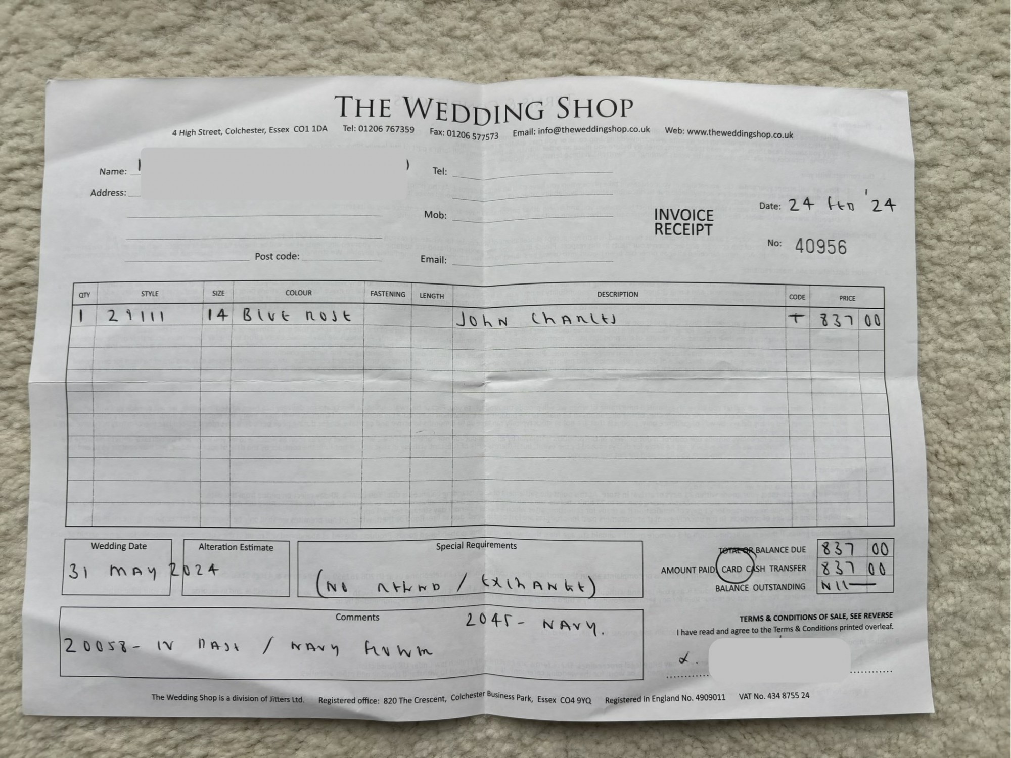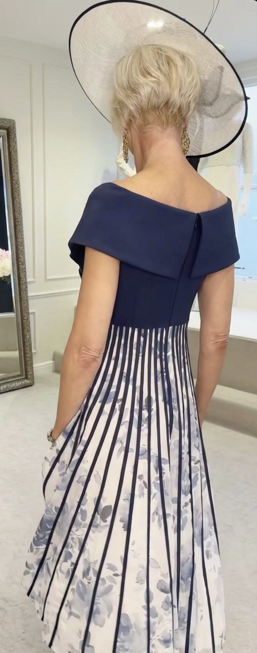 As new, only worn for a few hours and received so many compliments. Purchased from the wedding Shop in Colchester. This striking off-shoulder dress is the epitome of modern sophistication, showcasing a sleek navy bodice that elegantly transitions into a dramatic off-shoulder neckline. The dress’s bodice wraps around to accentuate the figure, then flares out into a full, flowing skirt adorned with bold navy stripes atop a delicate floral print. The unique pleating of the stripes creates a mesmerizing optical effect, adding movement and depth. Perfect for formal events, this dress pairs seamlessly with a statement hat, making it a complete, head-turning ensemble.