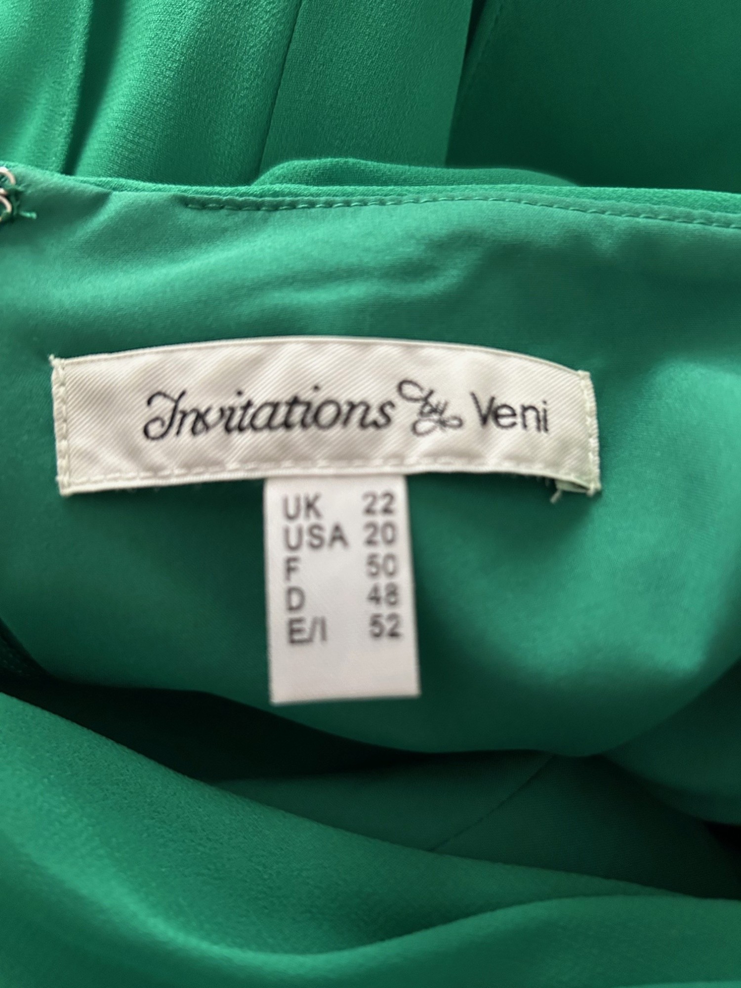 Absolutely stunning Invitations green MOB dress in green. With sweeping chiffron effect, bling waistline and A line skirt. Size 22. Felt extremely glamorous and recieved lots of compliments. I am 5'4" and it came to my lower calf (matching hat for sale seperately)