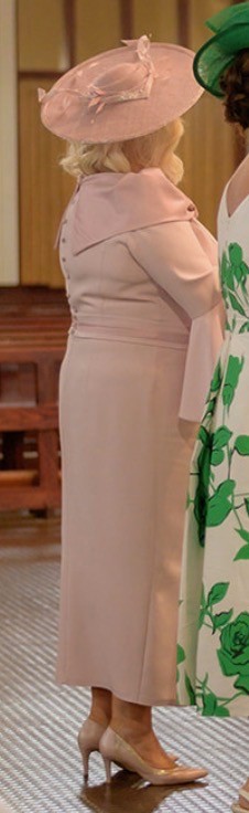 Baby pink Mother of the Bride Anoola D405 mid-length dress. Flattering, slimming fit, cowl neckline with slight shimmer detail around collar, belt and inset of sleeve. 3/4 length flute sleeve, and button detail on front and back of dress.