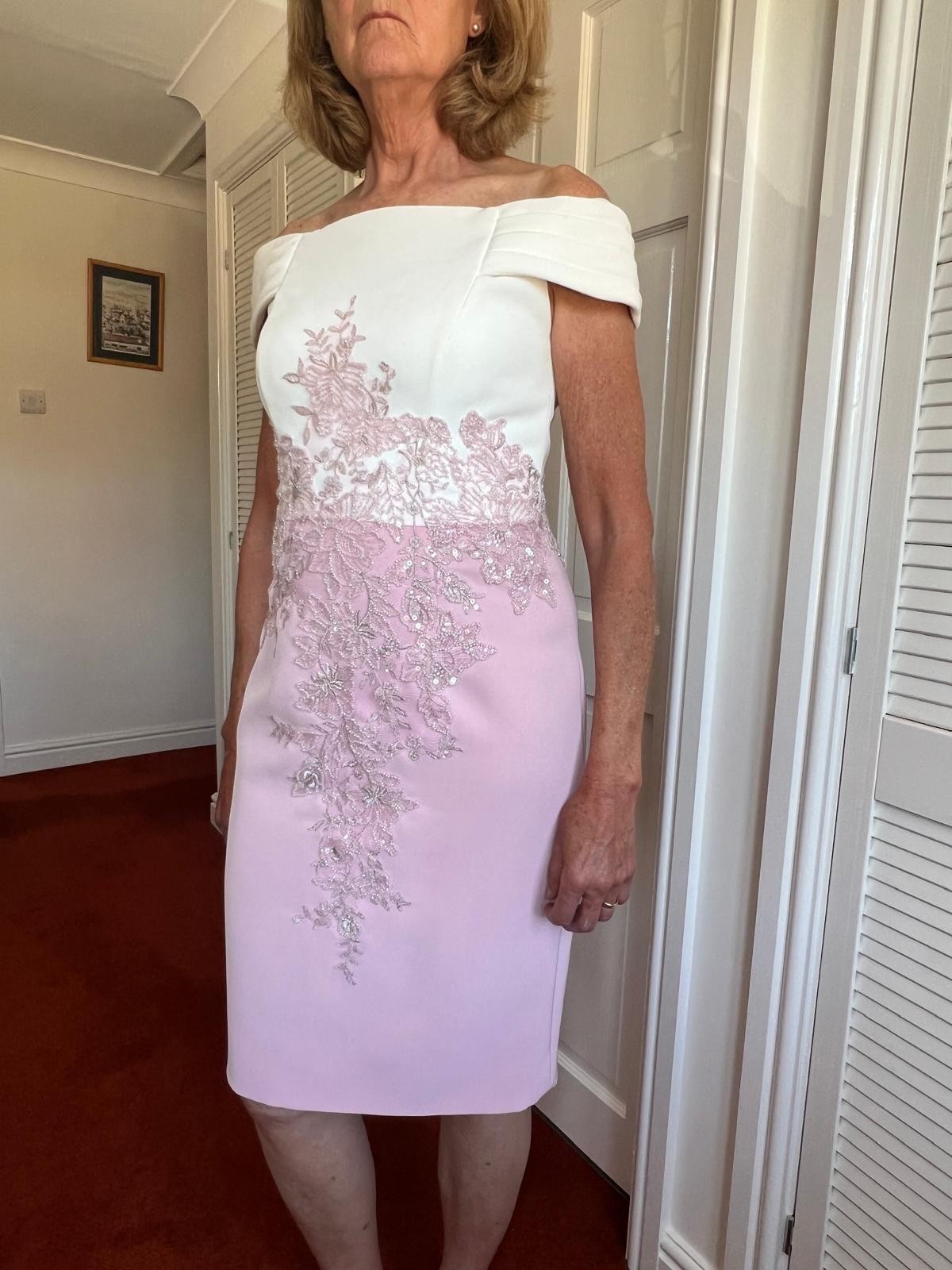 Blush/white dress with white jacket. Sits just off the shoulder.