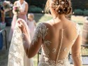Fitted sheath crepe dress with beautiful lace and bead detail. Illusion neckline. This dress was the sample size with no alterations apart from the bustle being added by the boutique. The bustle was handy at the end of the evening, but I used the finger loop for most of the day. The bustle is on a small tie just below your bottom, a bridesmaid can do it for you easily (even when under the influence, although she did practice sober). It doesn't show when the train is down and it still lies flat. It's internal.
