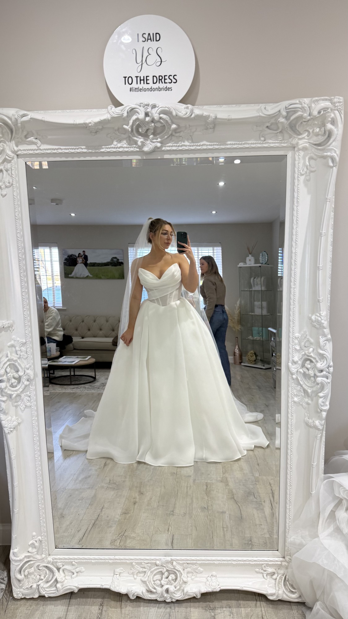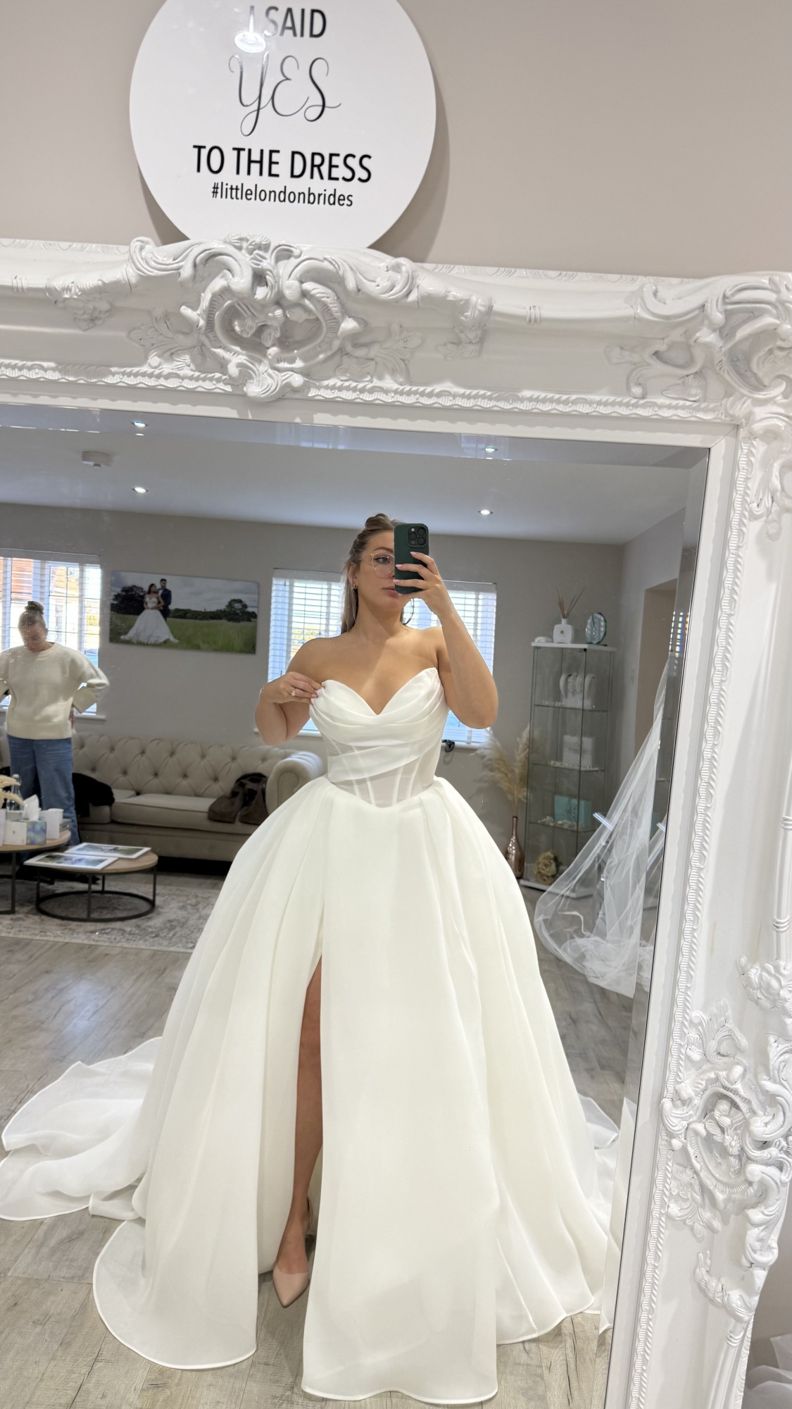 The Filippa is a romantic organza ballgown featuring a draped sweetheart neckline with delicate detachable off-the-shoulder straps, allowing you to style it strapless or with soft sleeves. The structured corset bodice and flattering basque waistline beautifully shape the waist before flowing into a dramatic full skirt with a subtle high slit and elegant train. A lace-up corset back with bow detail completes the look for a timeless, fairytale-inspired bridal style.