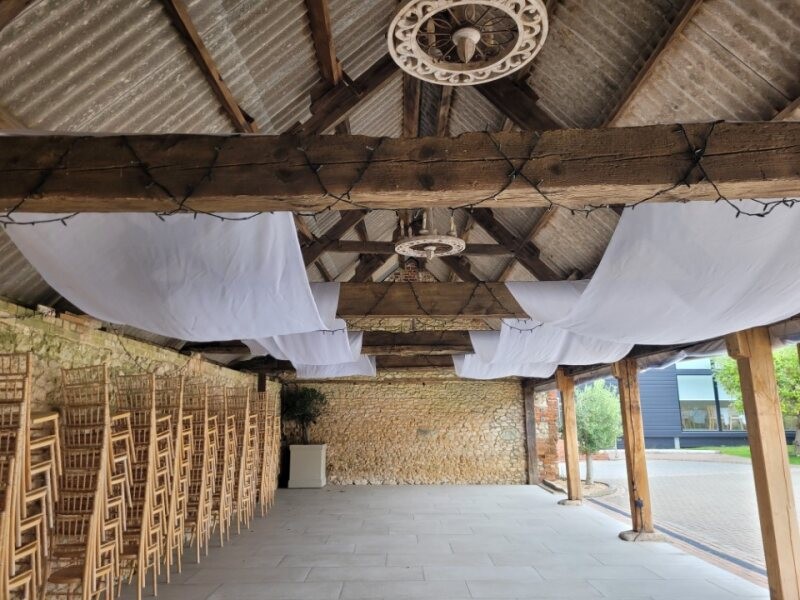 High impact, stunning large white drapes. Used at my wedding draped over some beautiful rustic wooden beams, as pictured.