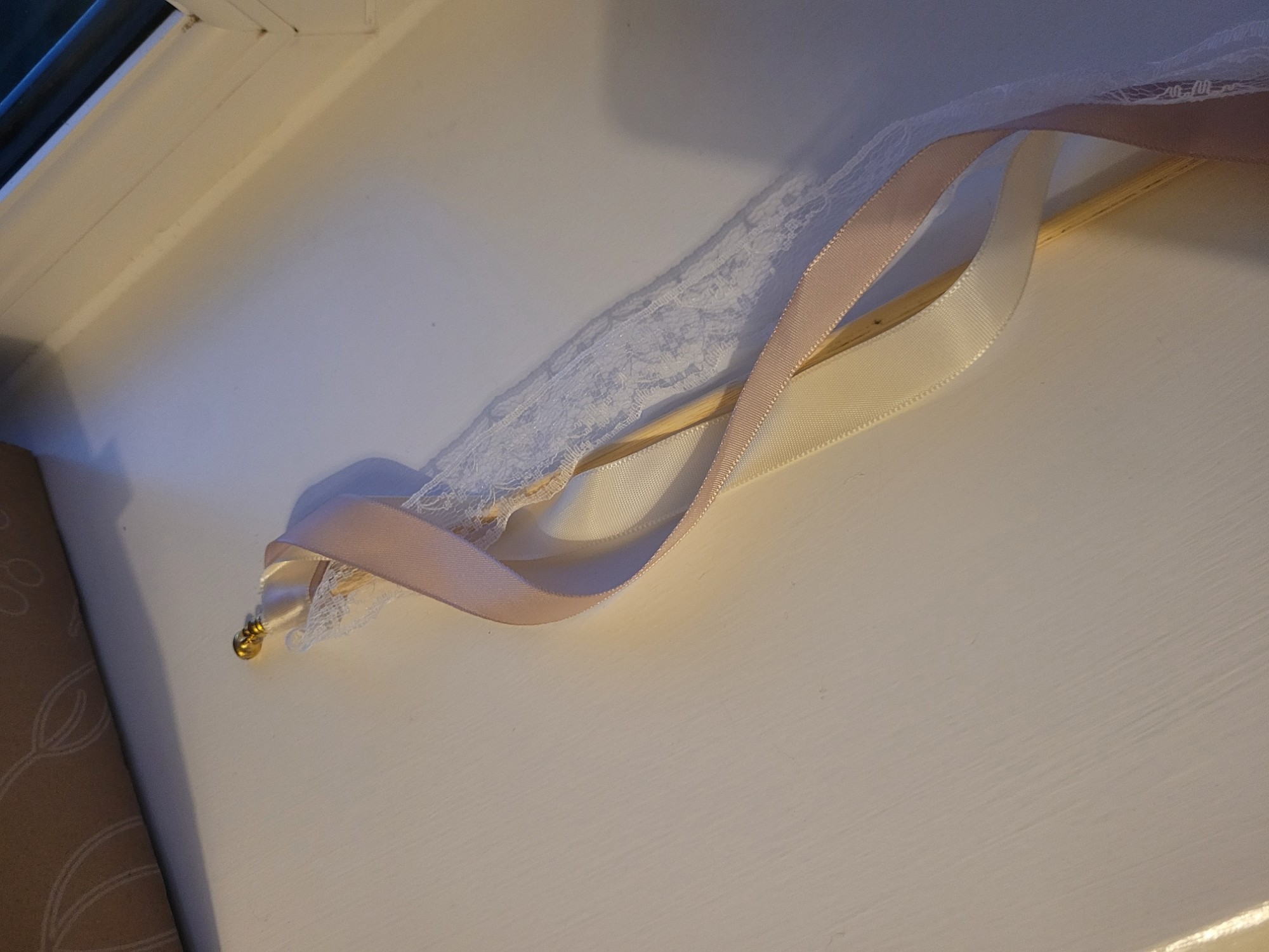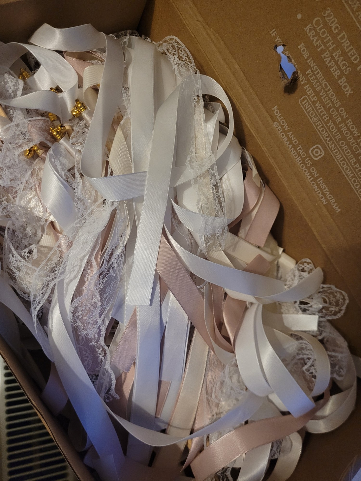 63 ribbon wands - Mix of peach / pinky colour and white ribbon wands with little bells on top.