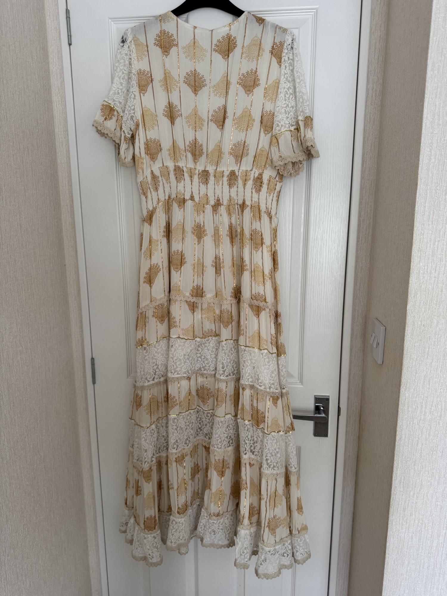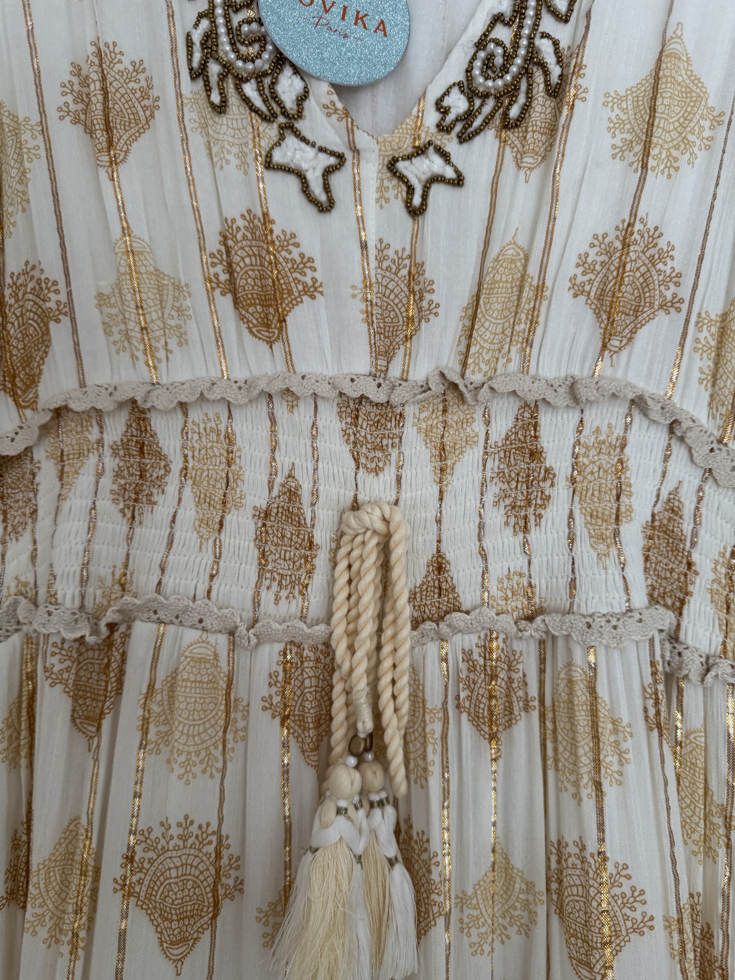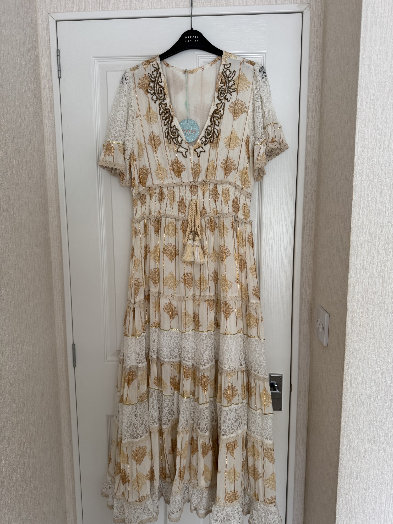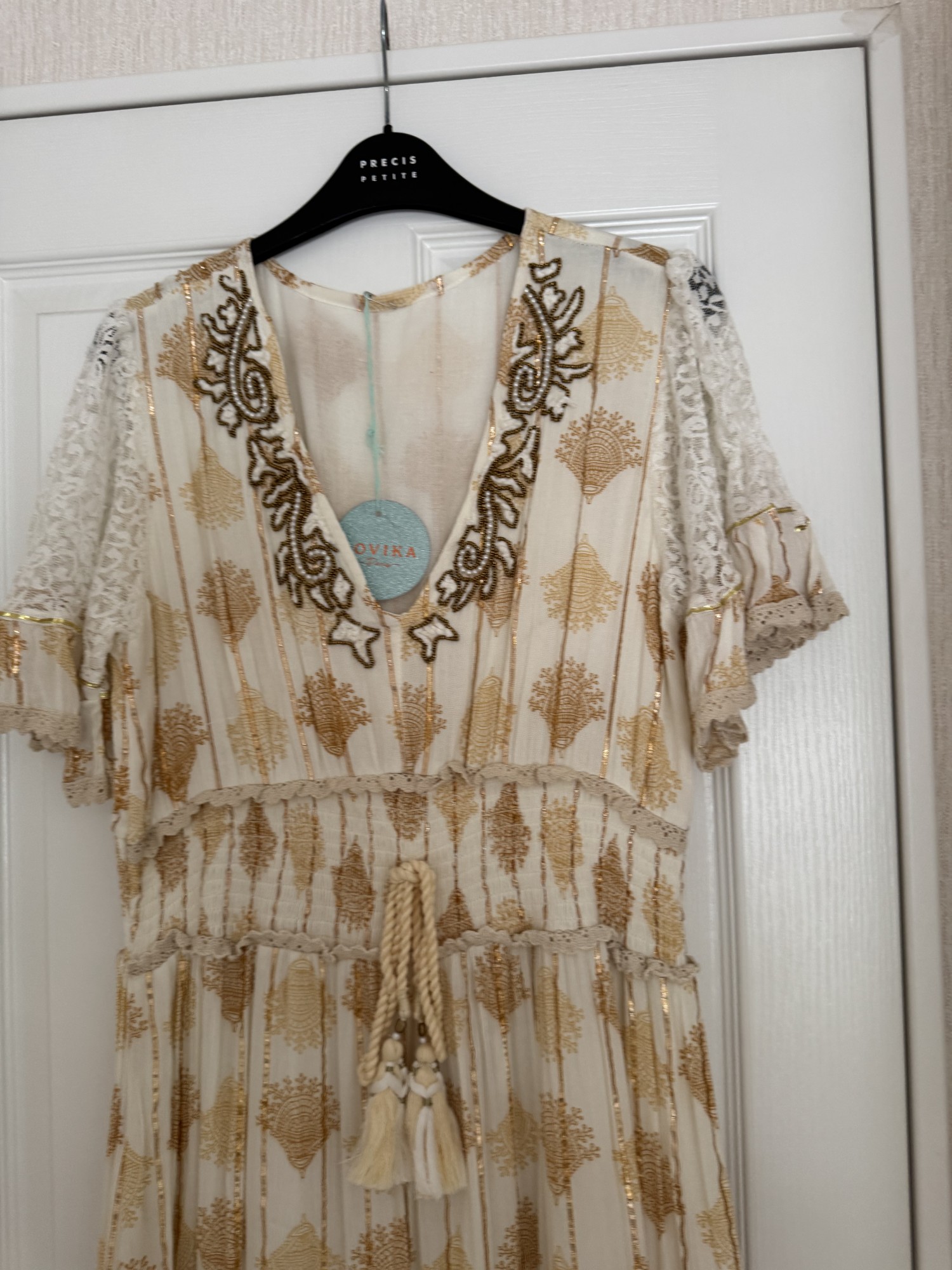 Lovika dress size medium brand new with tag in beige/ cream / & gold beads & cream lace with tassel tie