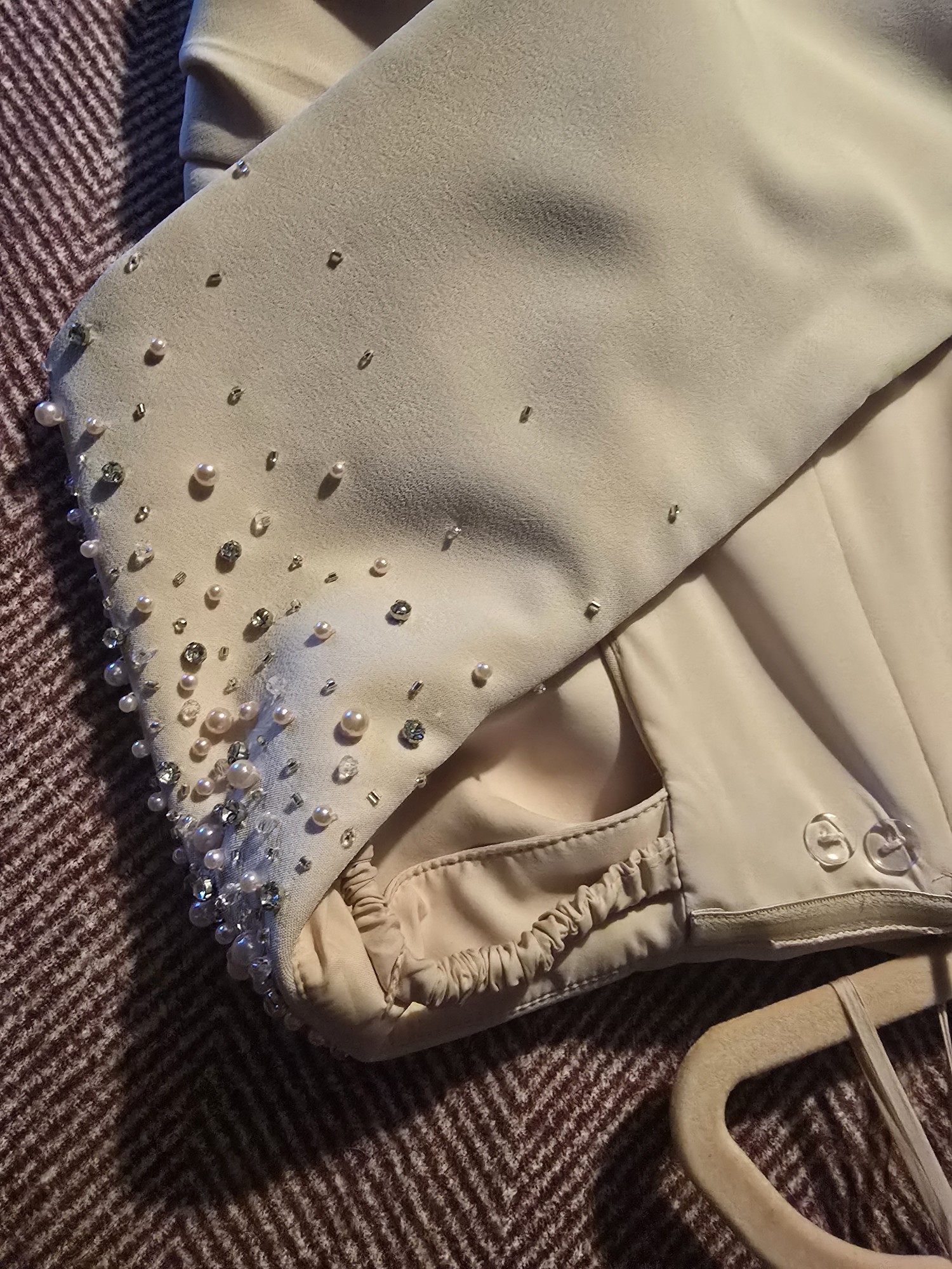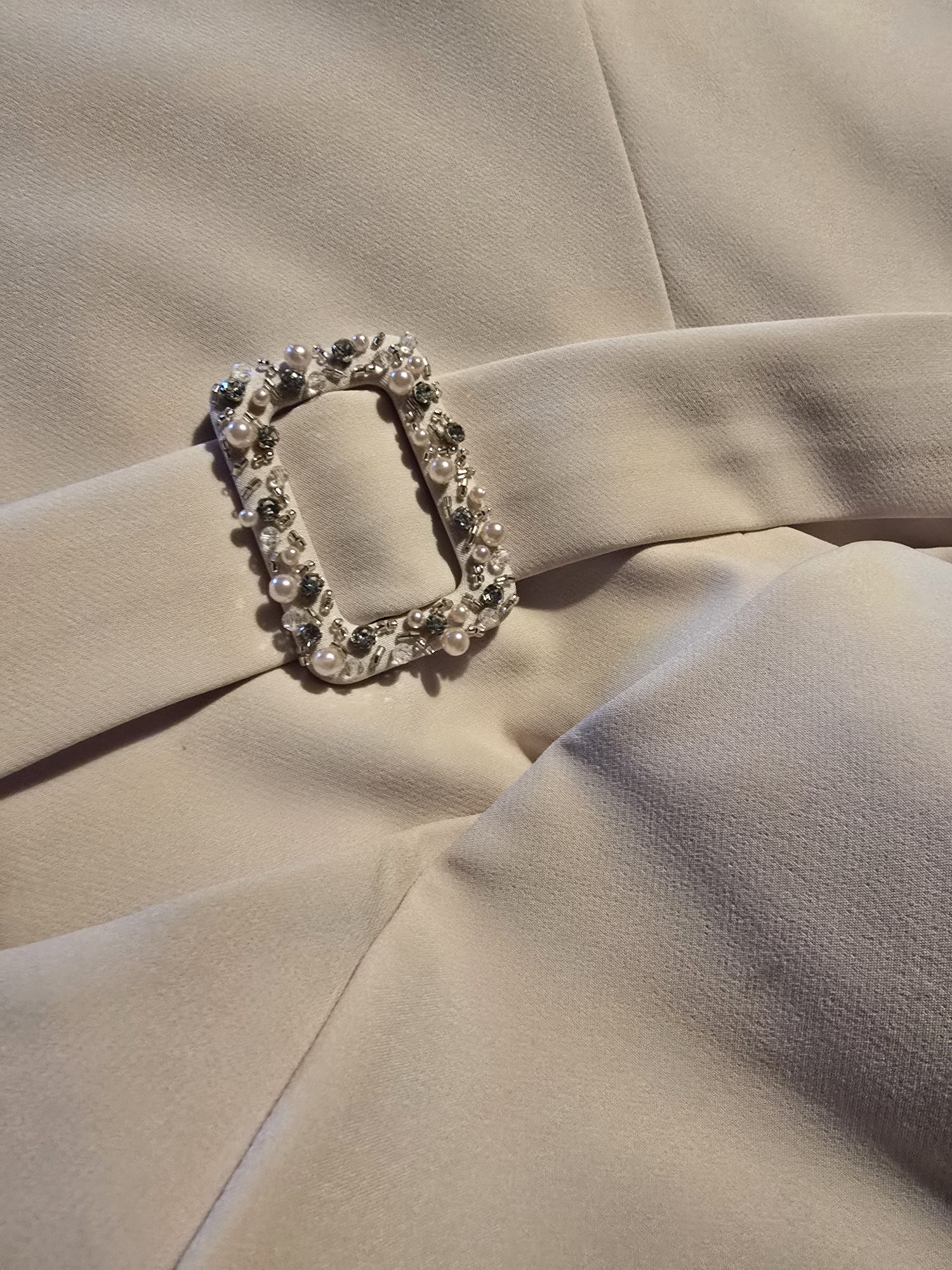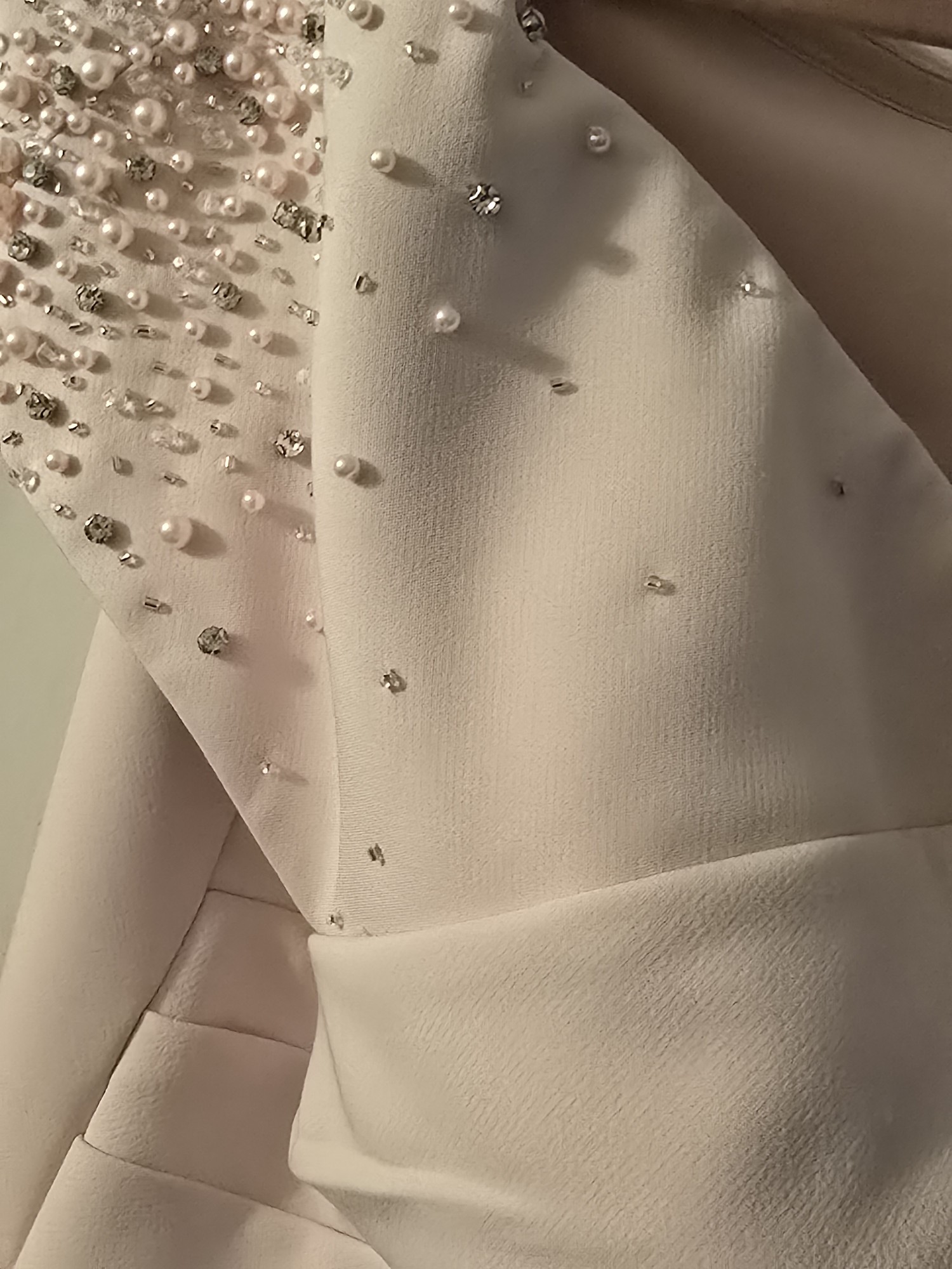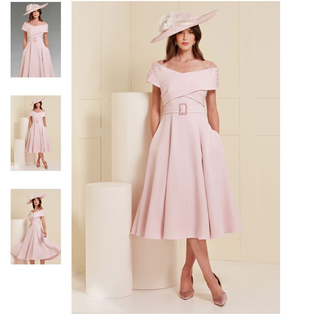 “A beautiful pink off-the-shoulder sequined dress with a matching belt and lovely details—it looks absolutely stunning on.”