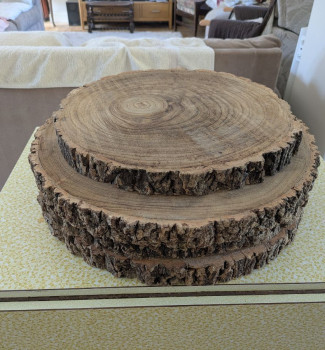 Rustic wood log slice centrepieces / serving platters.
