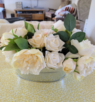 Elegant white faux rose / peony mix in silver metal bucket.