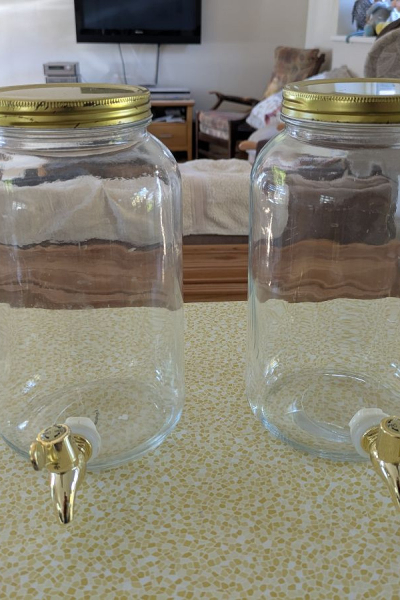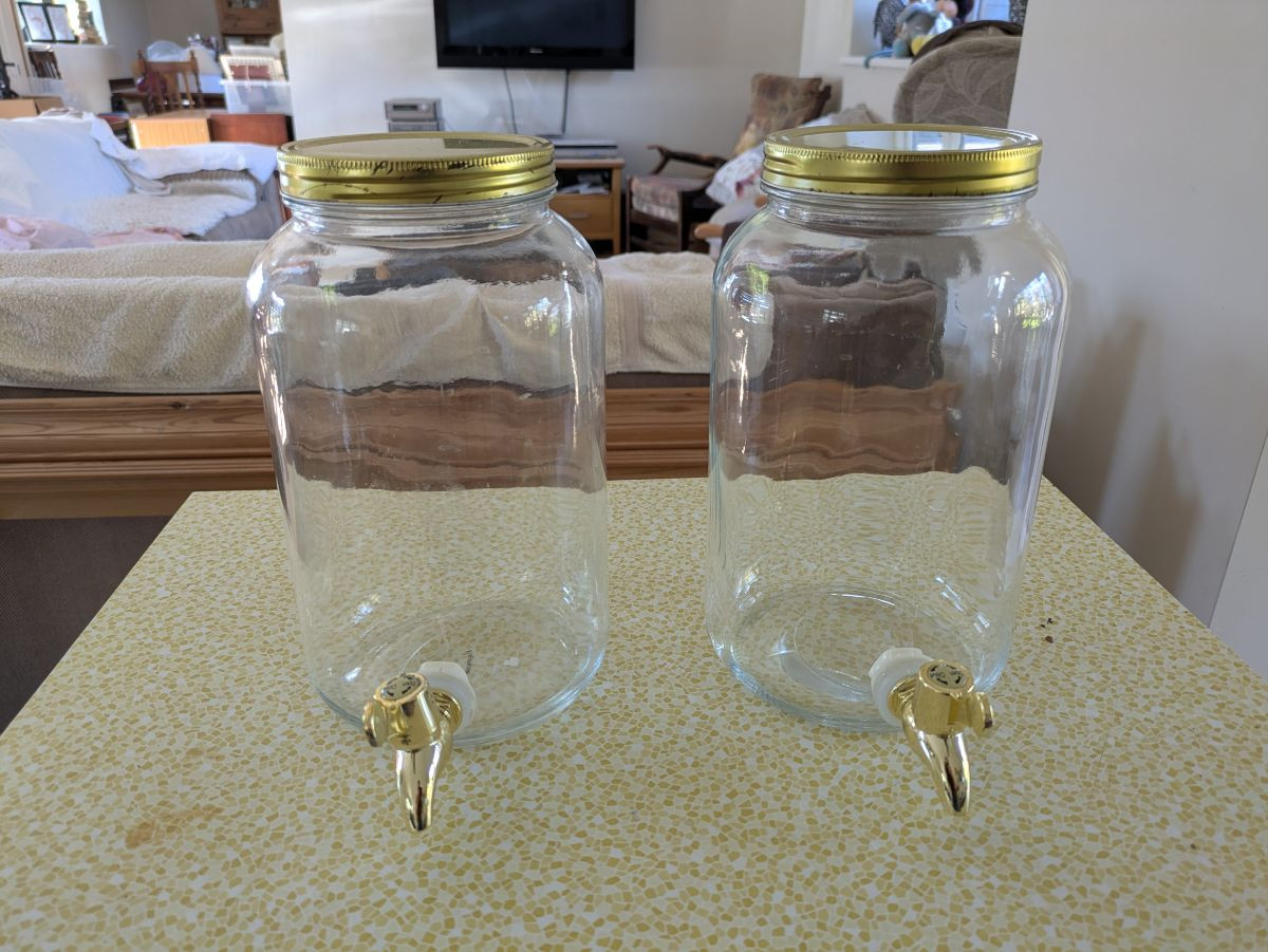 Glass drinks dispensers with taps.