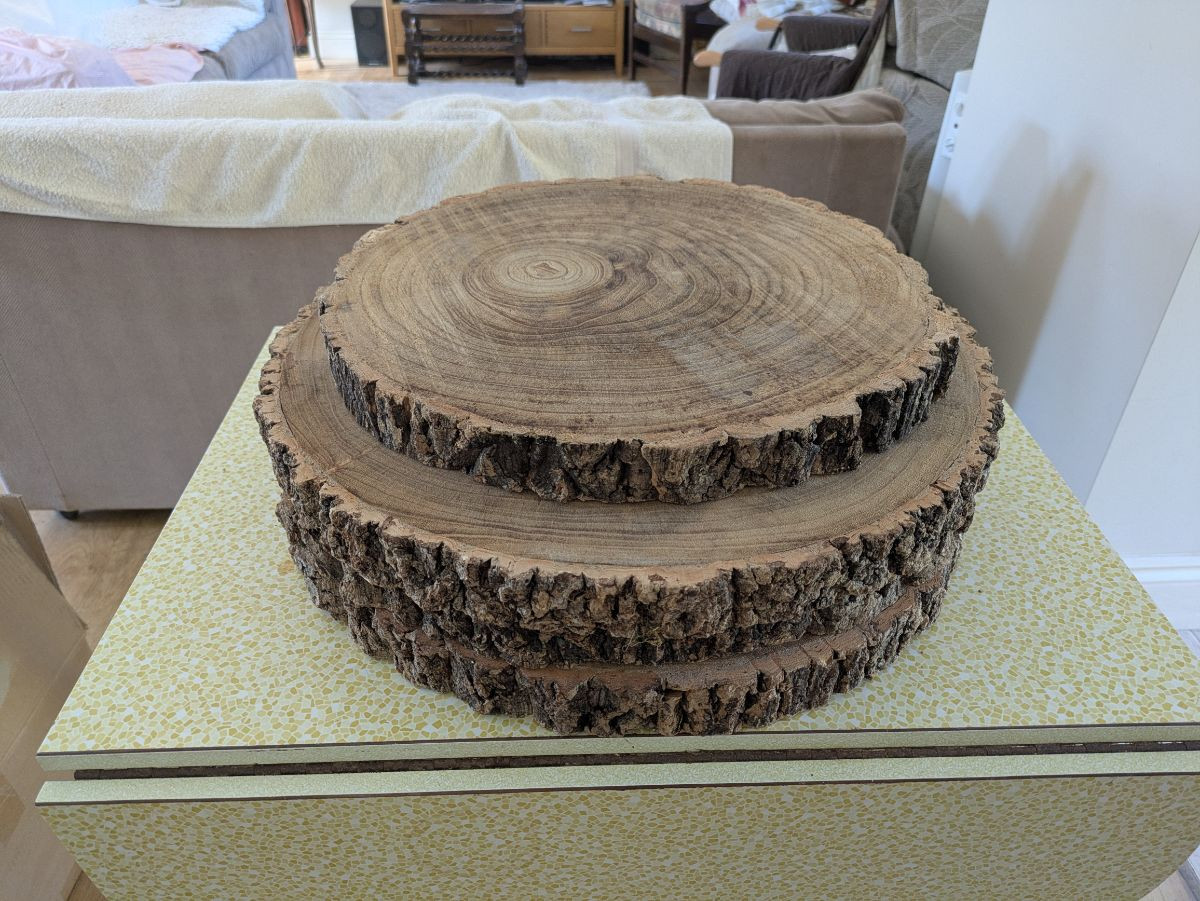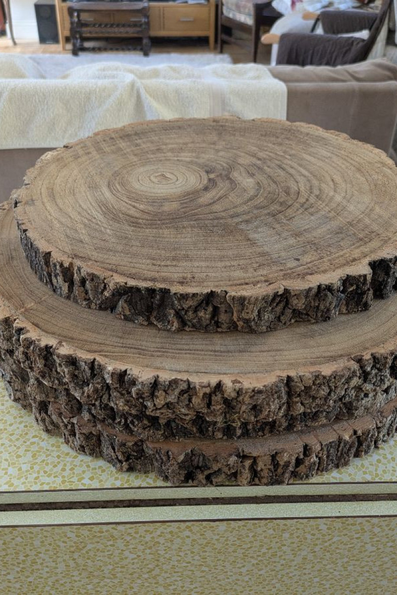 Rustic wood log slice centrepieces / serving platters.