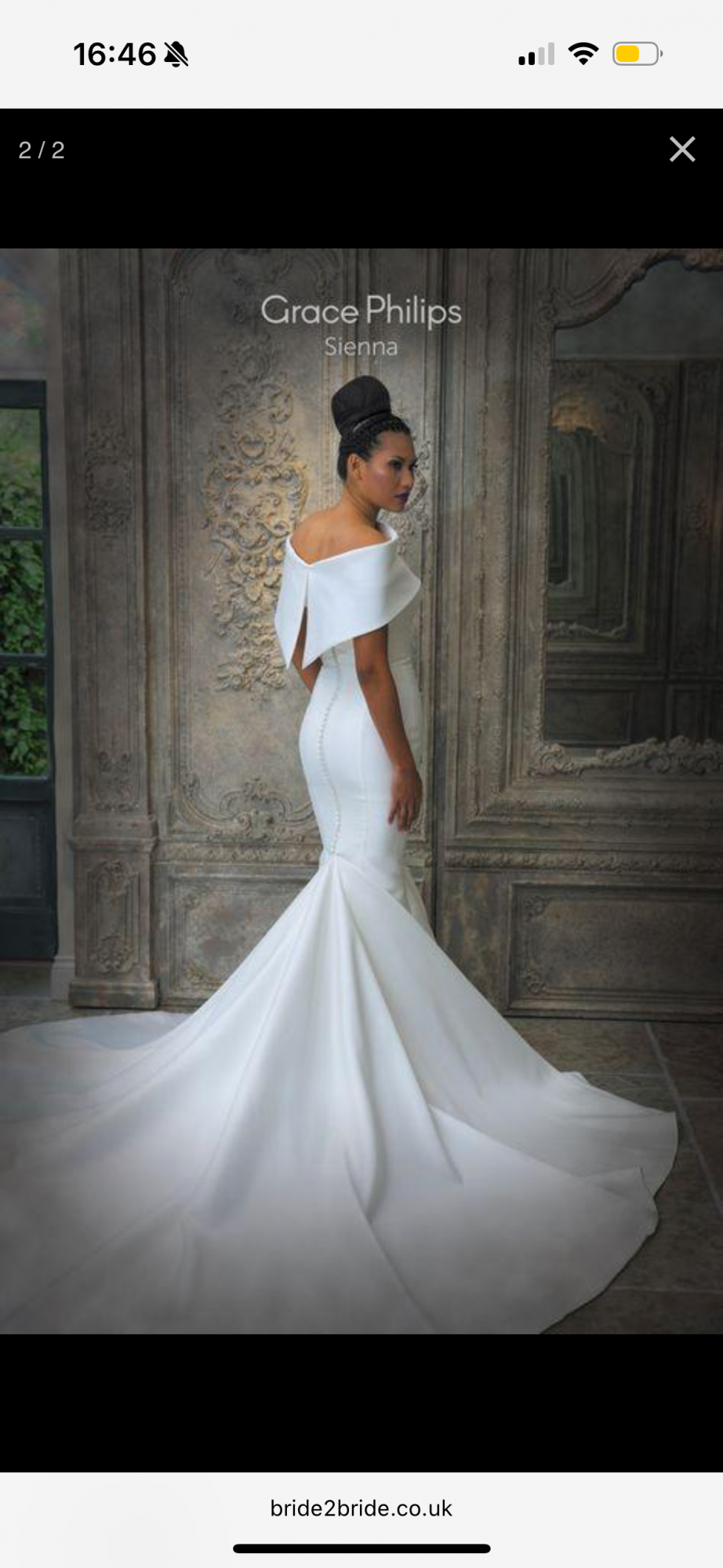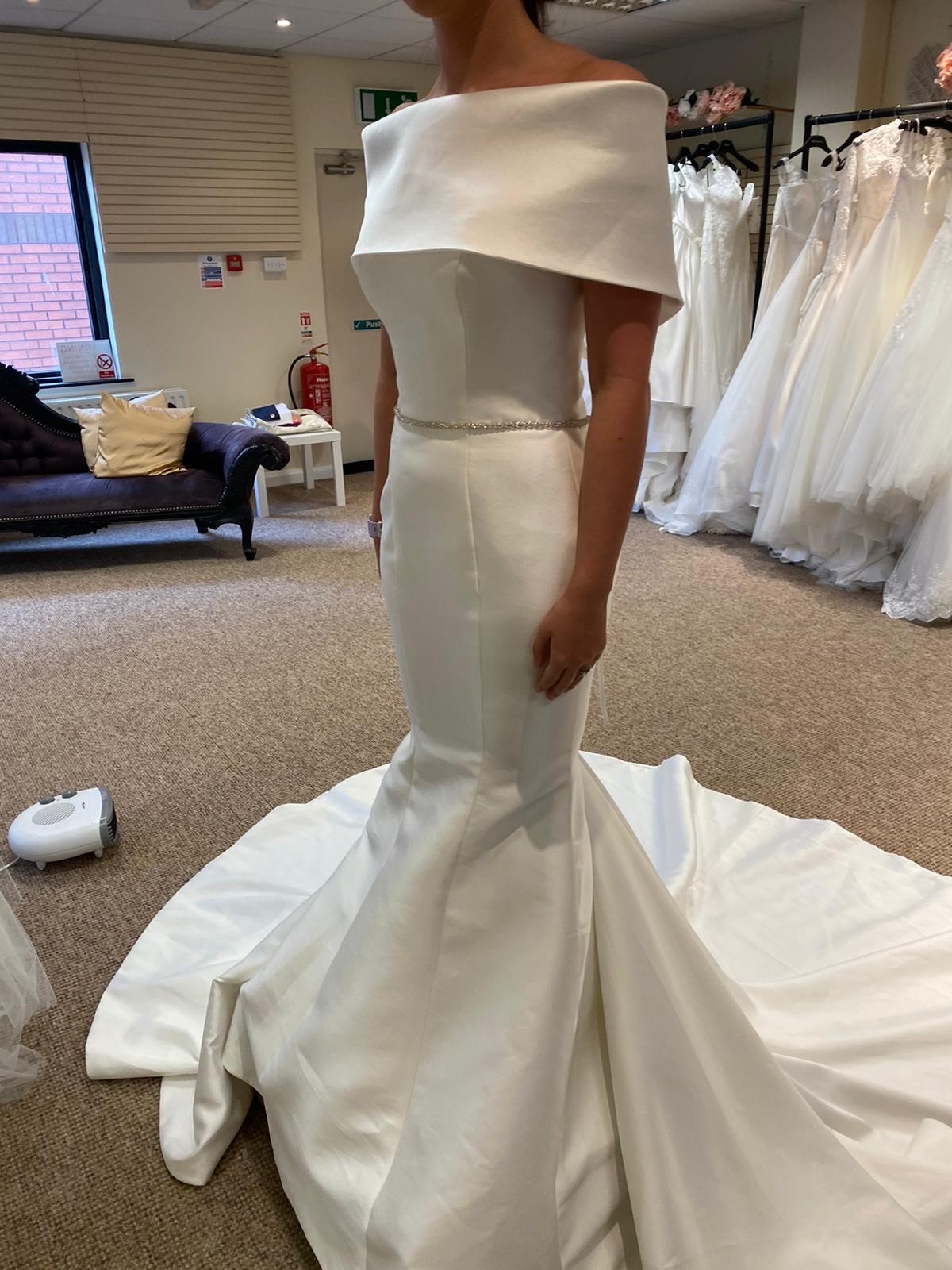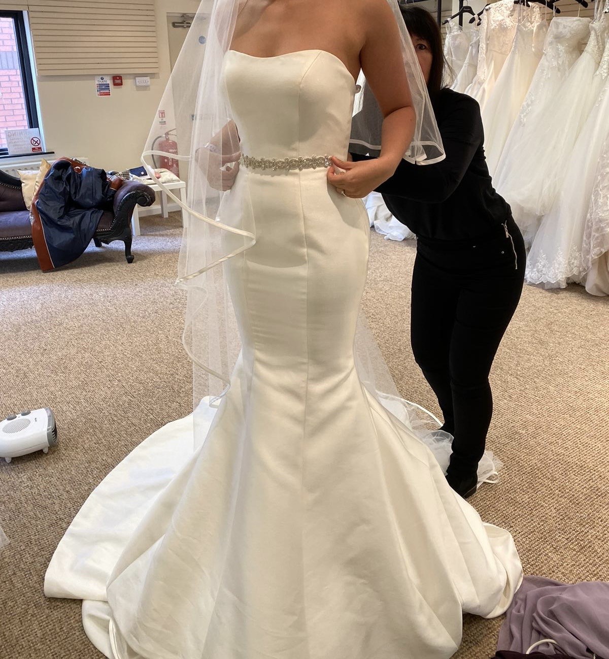 Dazzling Strapless simple fishtail wedding dress with sweetheart neckline and detachable cape. Fitted to the lower thigh and with a gentle flare, this dress has a huge 2 meter train.