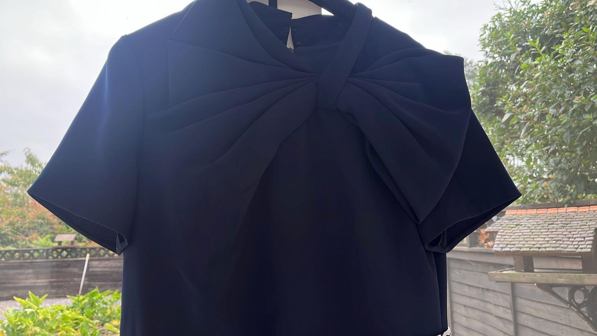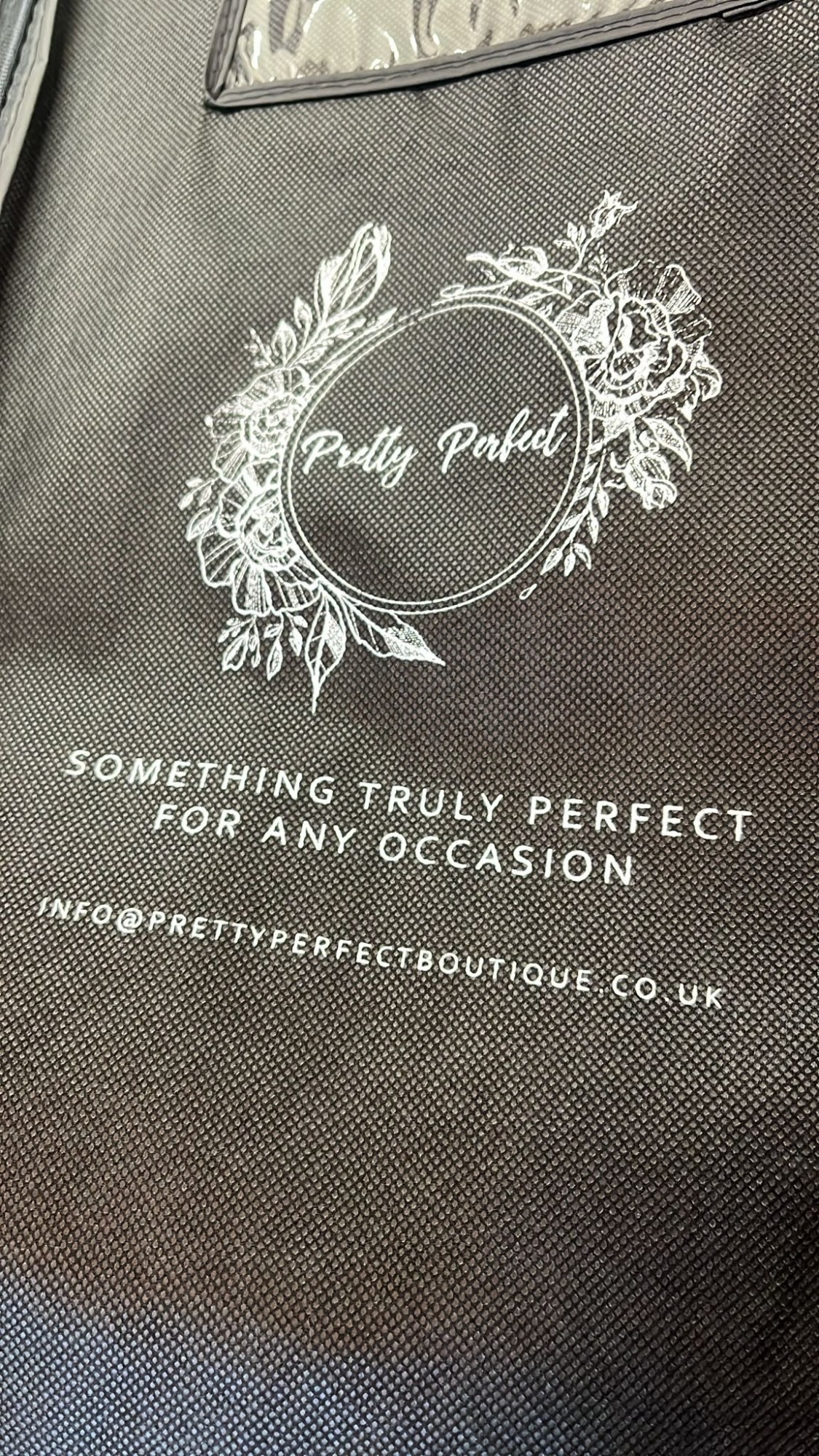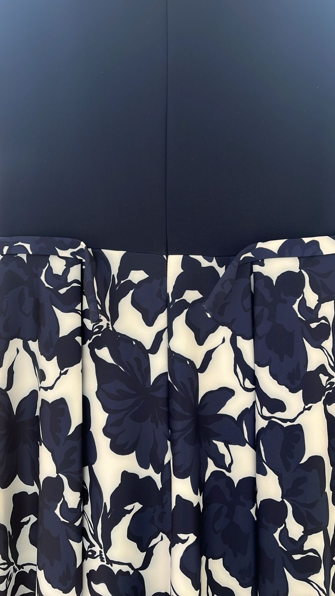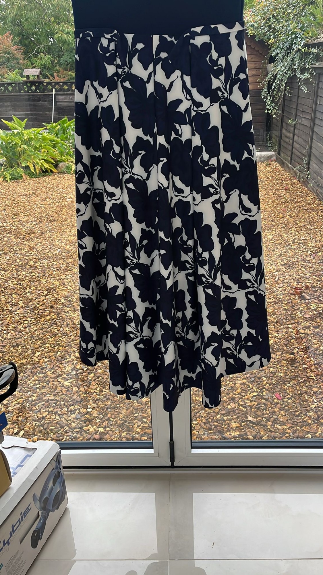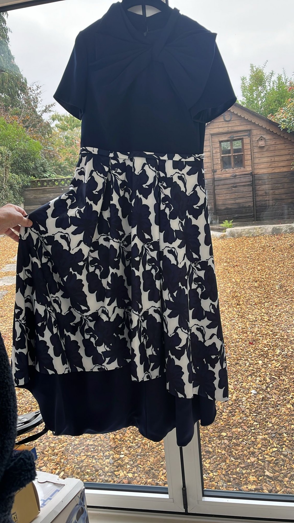 Navy/white dress off the shoulder (optional) with big bow and full skirt.fitted in at the waist longer at the back . Beautiful dress . Stunning had and bag if wanted sold separately !