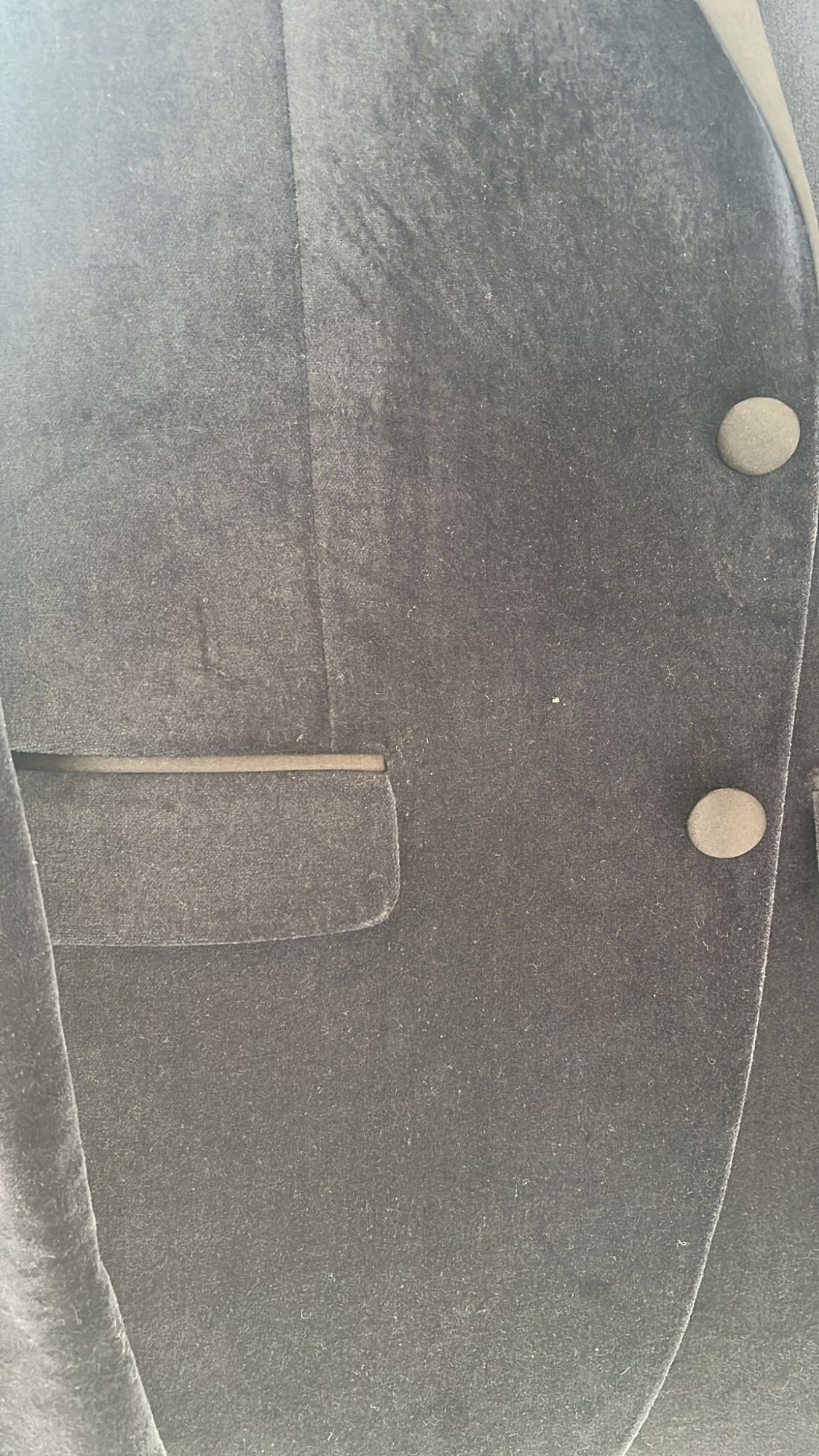 Navy blue velvet jacket black lapels . Black trim in pockets