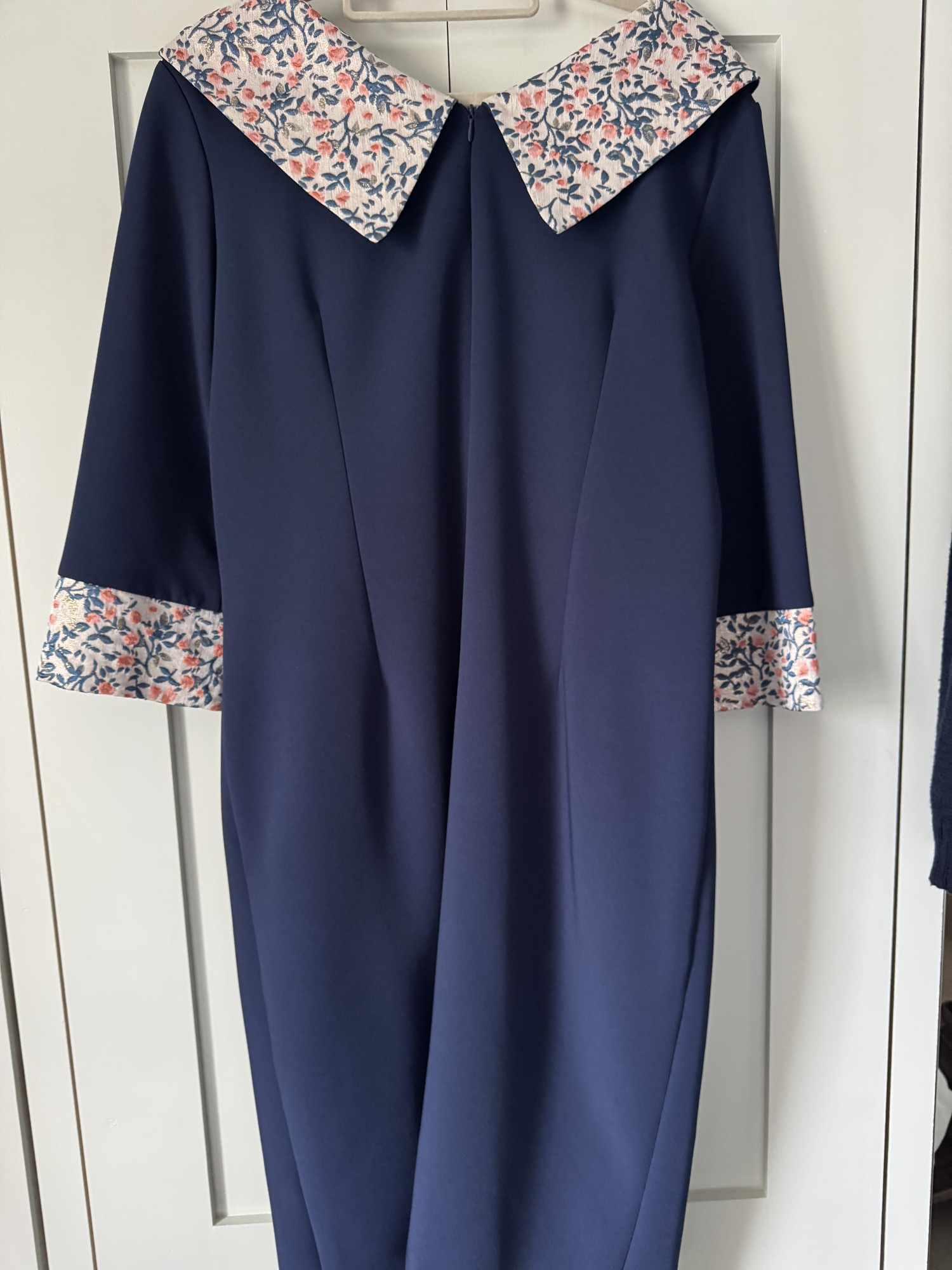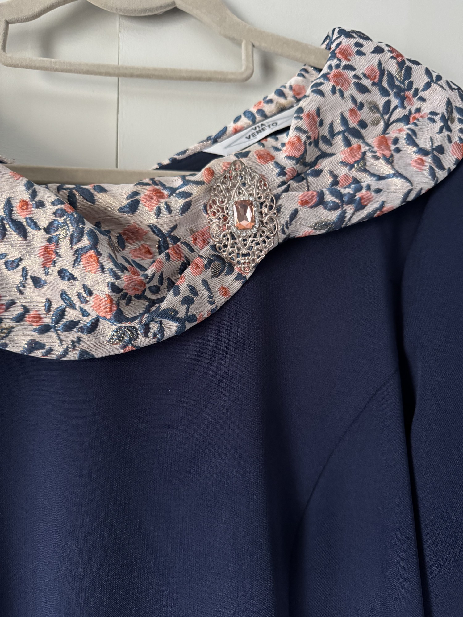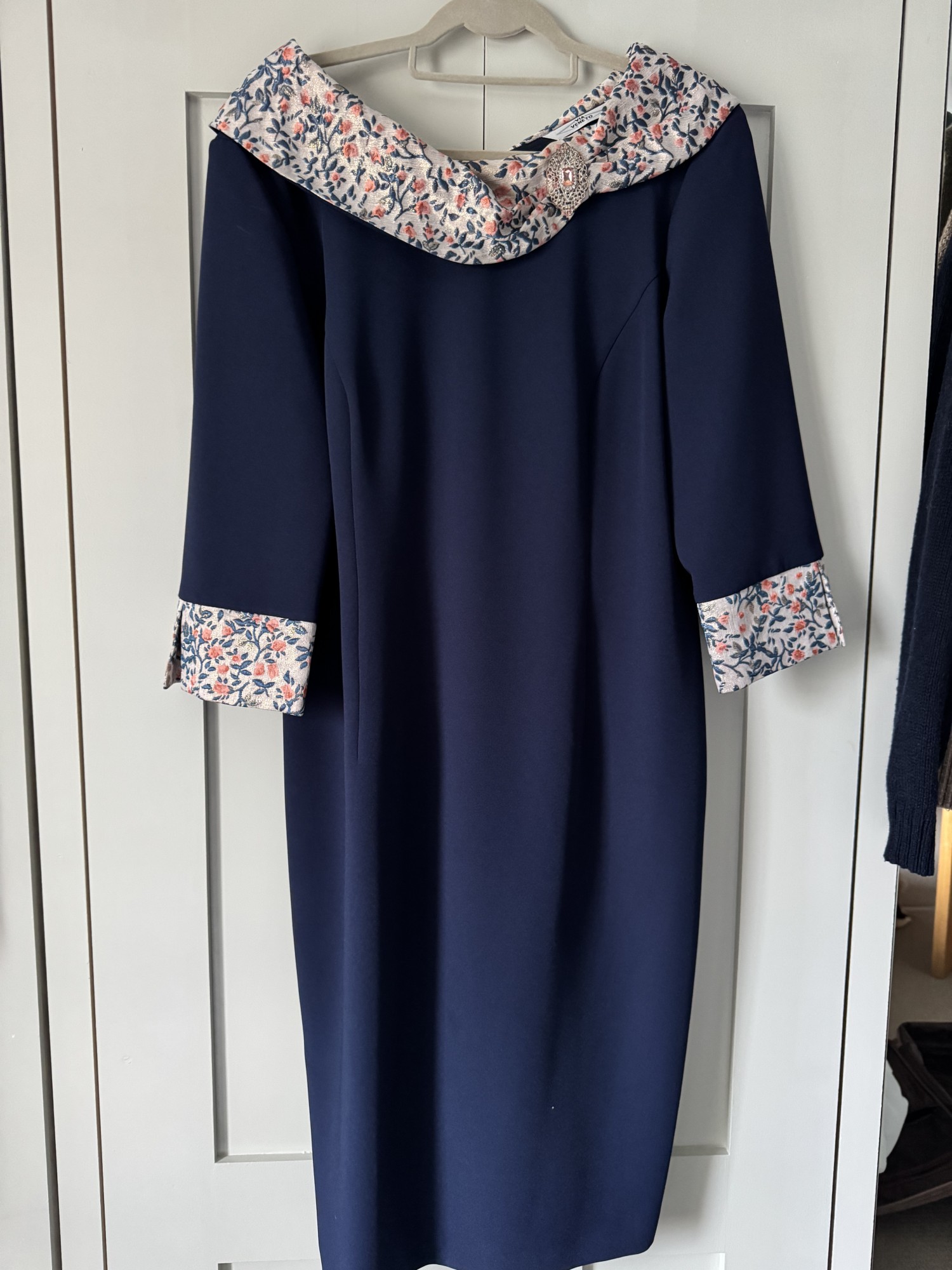 Beautiful navy and embroidered Via Veneto dress with boat neckline and collar detail.