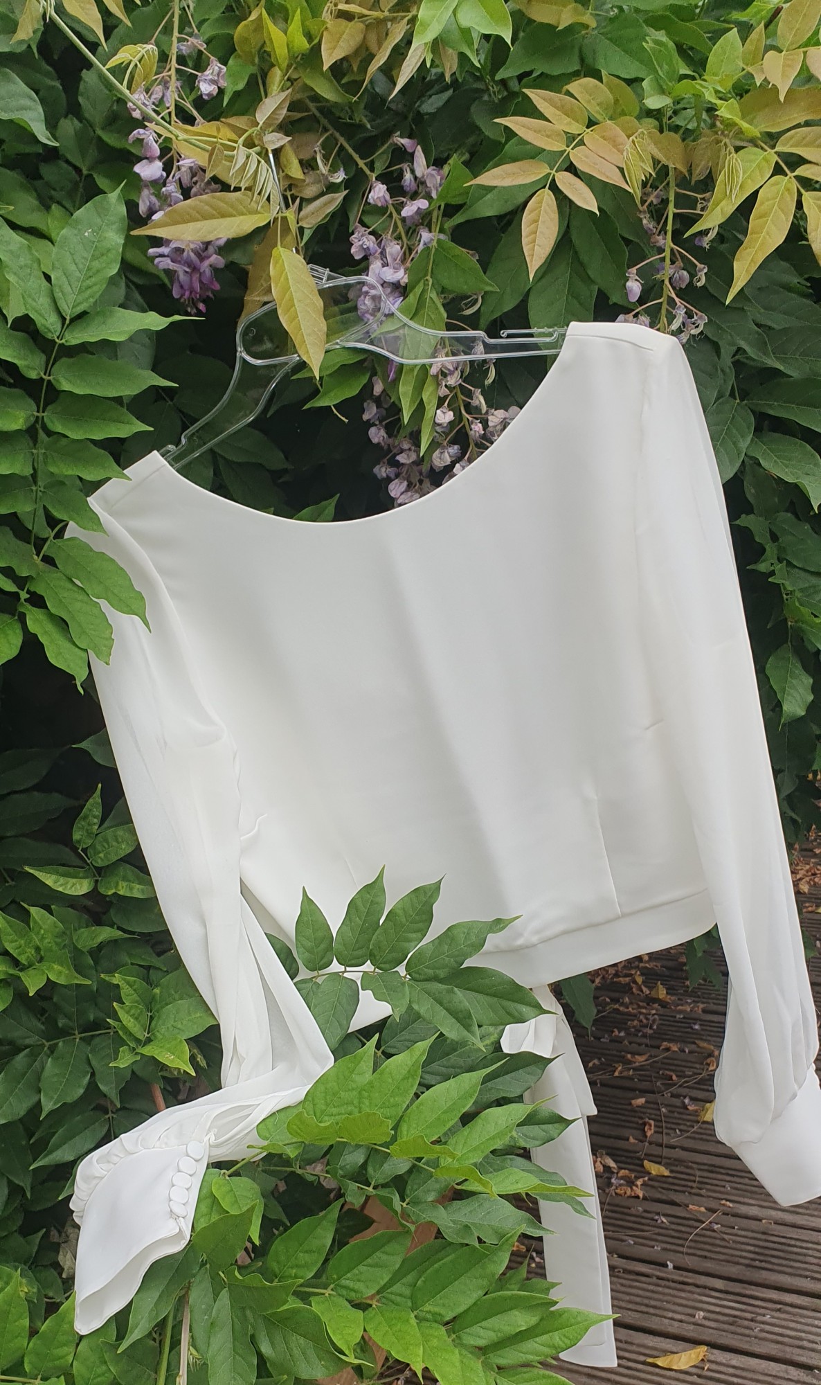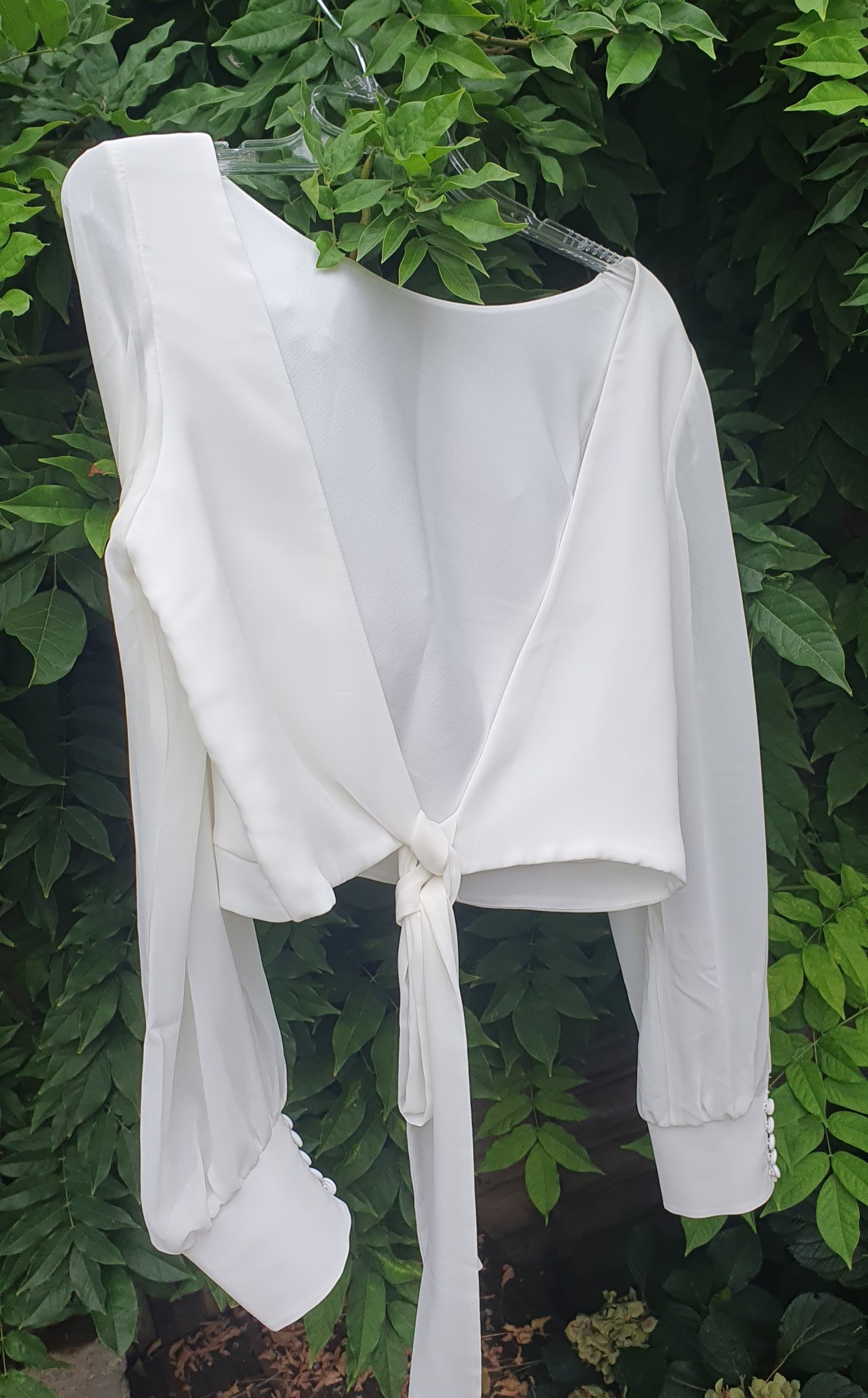 Beautiful long sleeved chiffon top with buttoned cuffs. V back to the waist with tie back