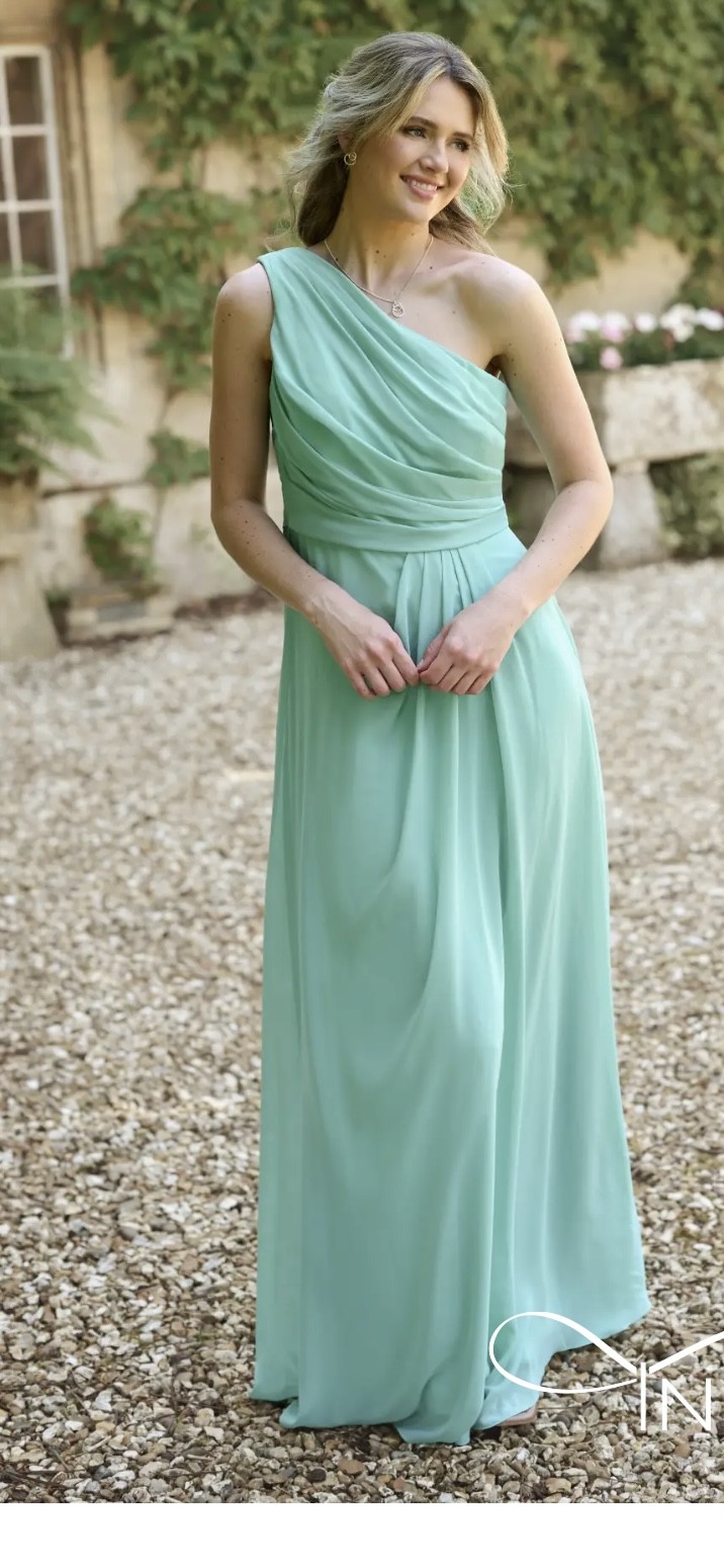 Mint Green Chiffon Bridesmaid Dress. One shoulder, Fitted bust, cinched waist then flows to floor.