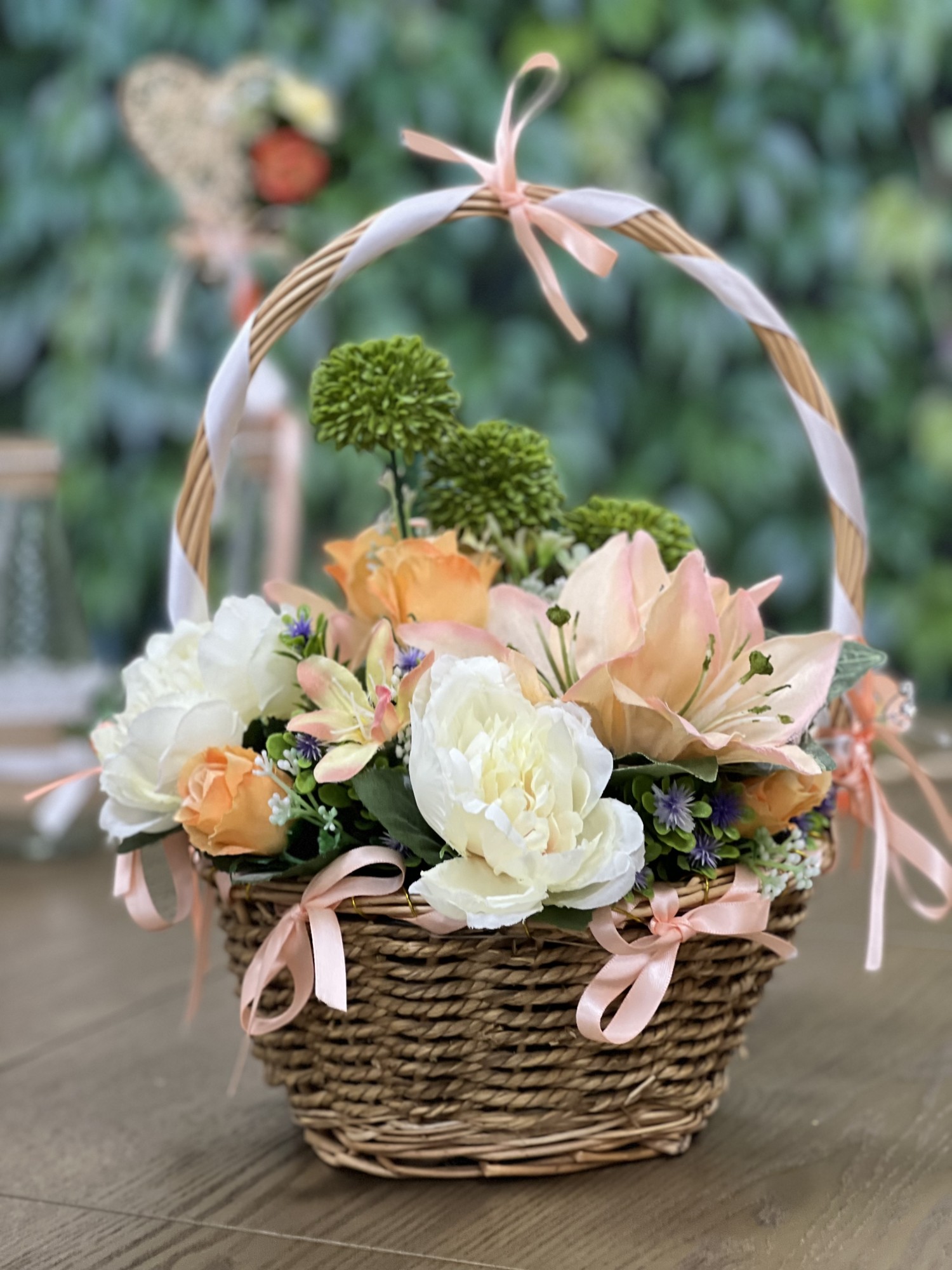 1 × flower girl basket (ivory peonies, peach roses, blush lilies with ribbon details)