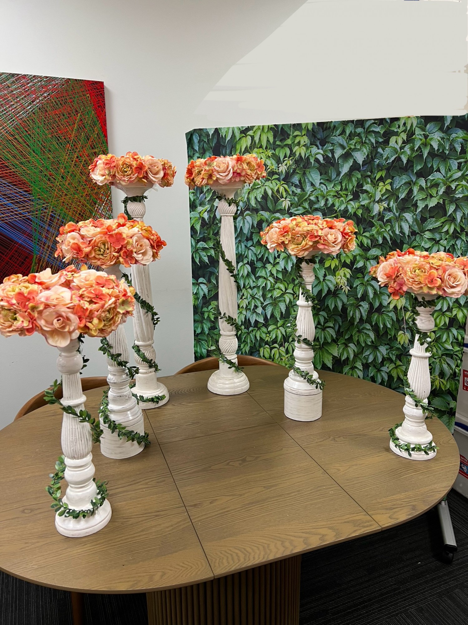 6 × ivory vine-wrapped candlesticks with peach florals (2 small, 2 medium, 2 tall)