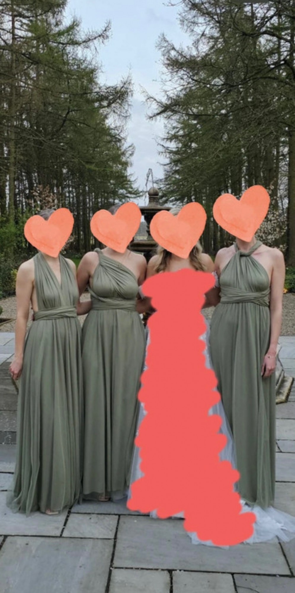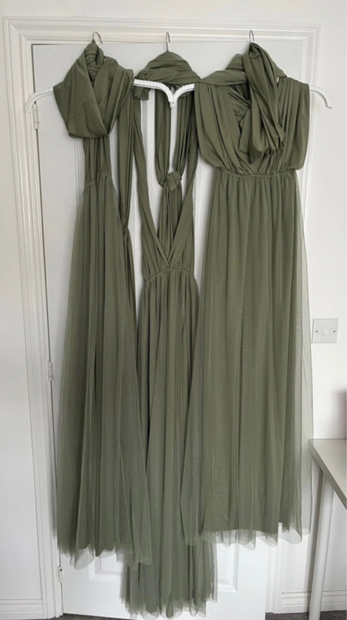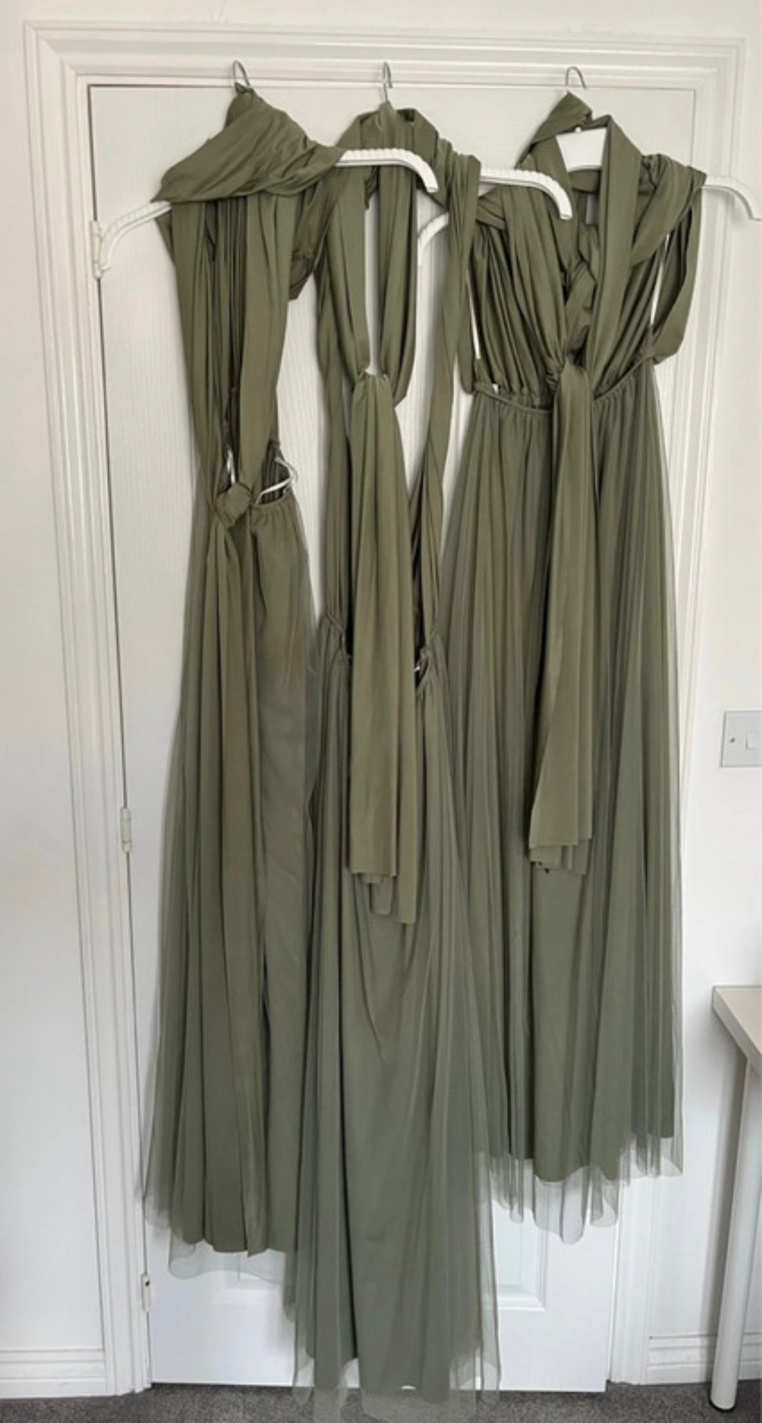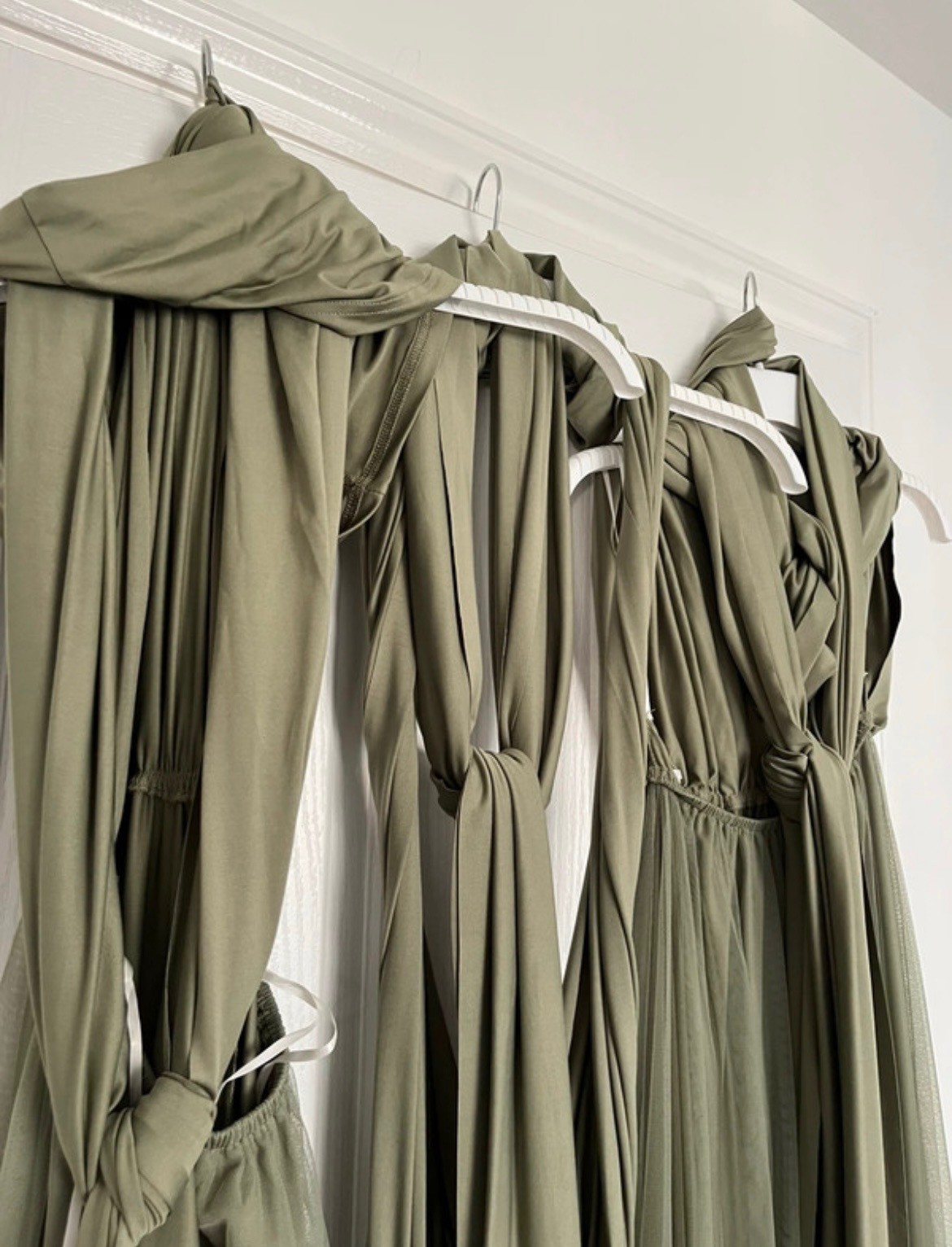 3x multiway bridesmaid dresses in light sage green with tulle overskirt