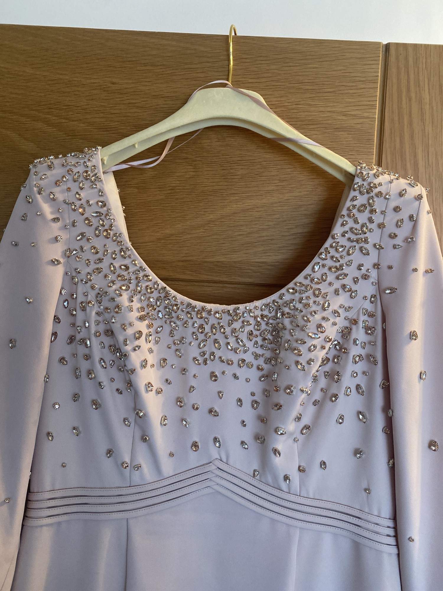 A classic fit and flare crepe dress, featuring a beaded bodice and 3/4 sleeves. Complete with contrasting plain skirt. Comfortable dress to wear.