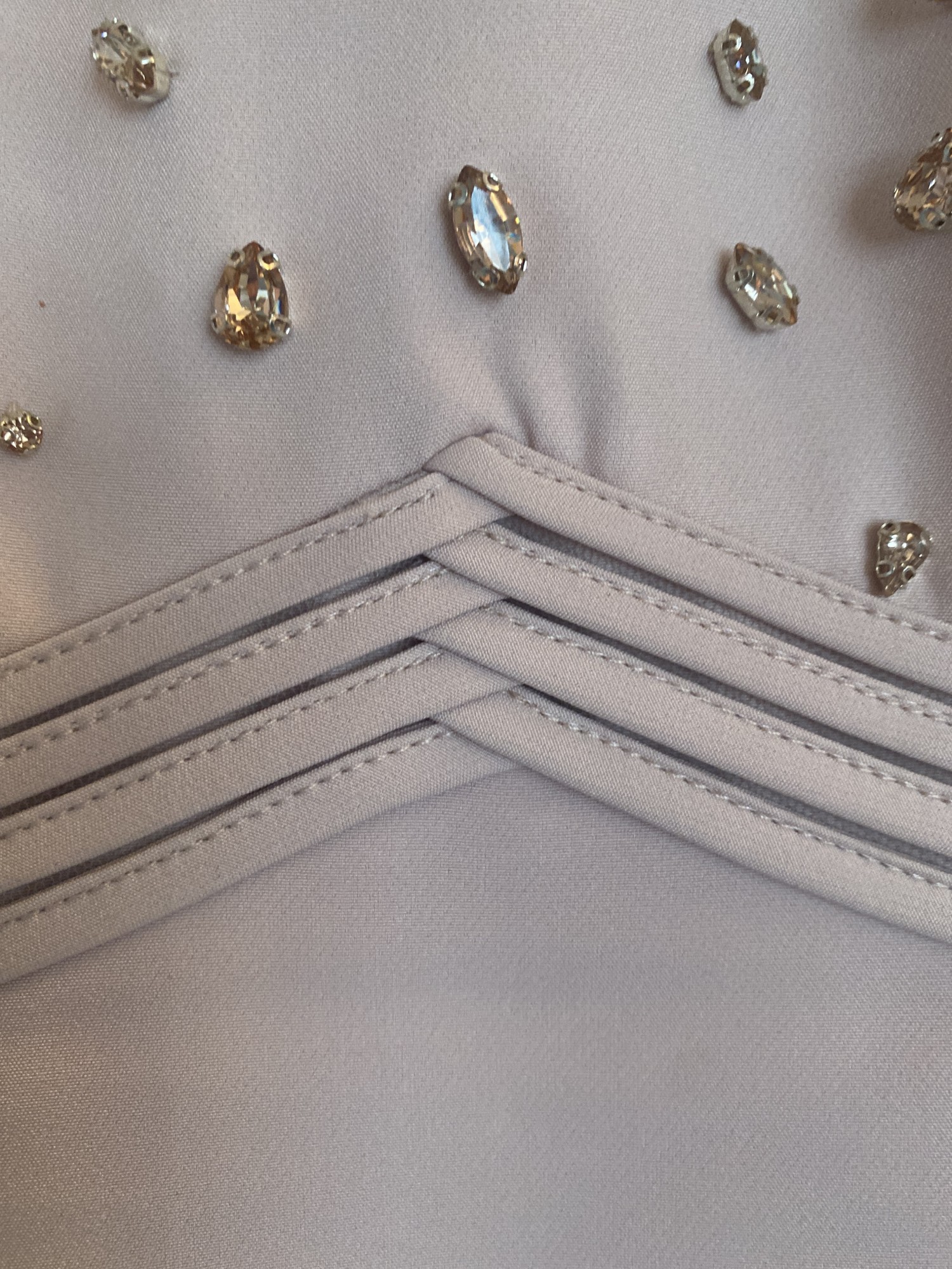 A classic fit and flare crepe dress, featuring a beaded bodice and 3/4 sleeves. Complete with contrasting plain skirt. Comfortable dress to wear.