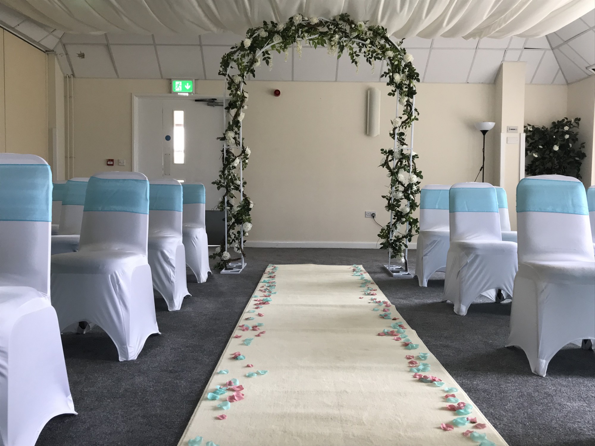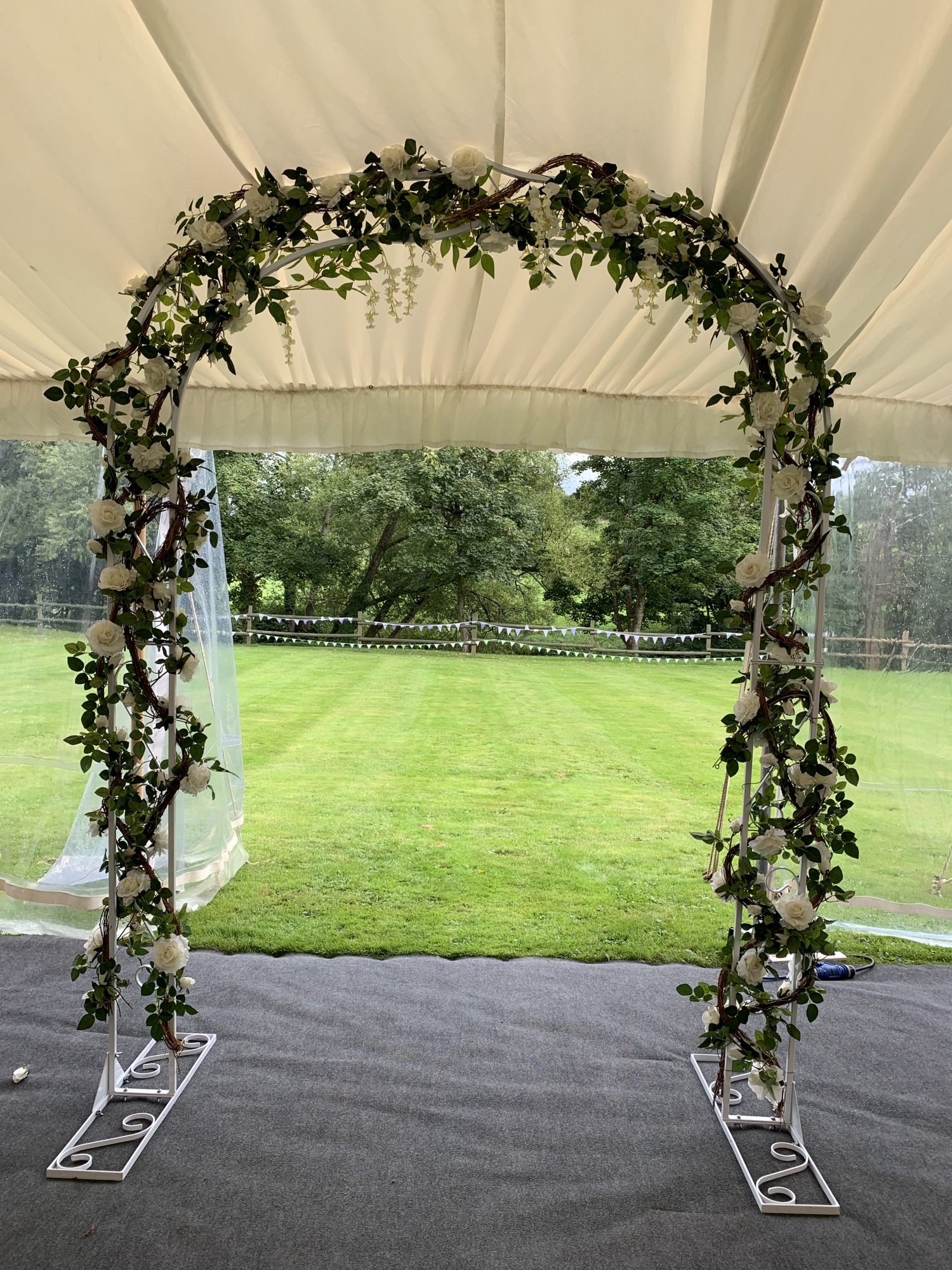 White metal wedding arch draped with silk garlands. I am selling the items from my wedding decor business as I have recently retired. The arch has been used many times but still looks gorgeous. It takes to pieces for transportation and taking into the venue. Ideal for your wedding and could be sold on afterwards, or to enhance a wedding decor business. Pick up only.