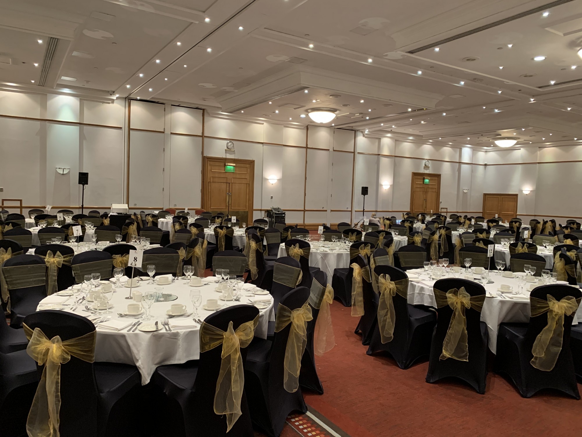 Black Lycra chair covers which fit most chairs with legs and arm rests.